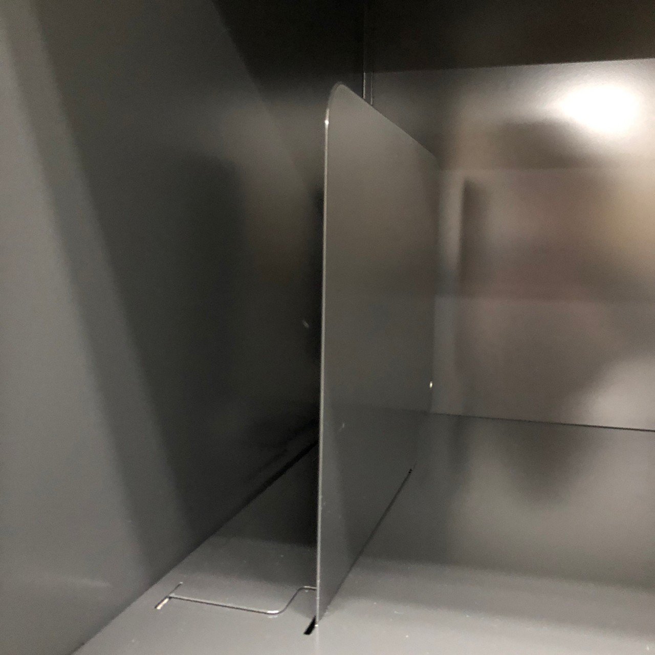 パソコンを立てて収納できる縦仕切り板付き。庫内にはA4ファイルはバインダーが縦に収納できます。手前にはちょっとしたスペースがありますので小物などの仮置き場に利用できます。扉裏のメールポケットに小物や使用頻度の高い文房具などを入れることが出来ます。