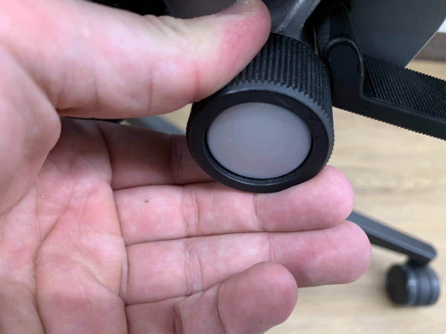 - レバーを引き上げながら座面を前後にスライドさせ、レバーを放すとロックします。背もたれに身体をつけた状態で膝の裏側と座面のエッジの間に5-8センチほどの隙間ができるのが理想的です。