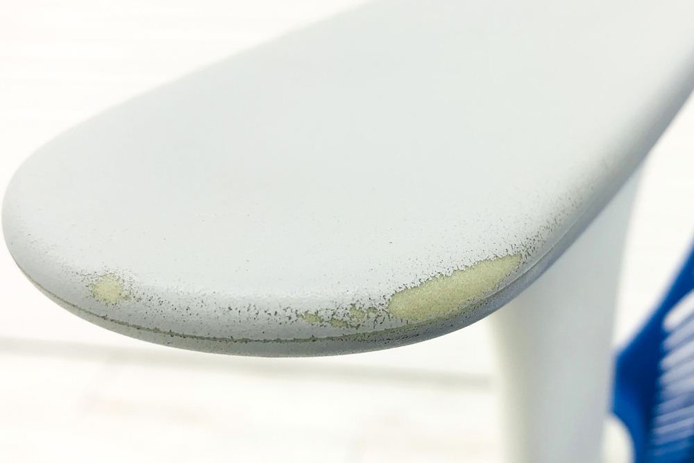 - かなり強い濃い黄ばみ・変色が商品全体にある。(例、座面・背もたれ、脚部等にある。)