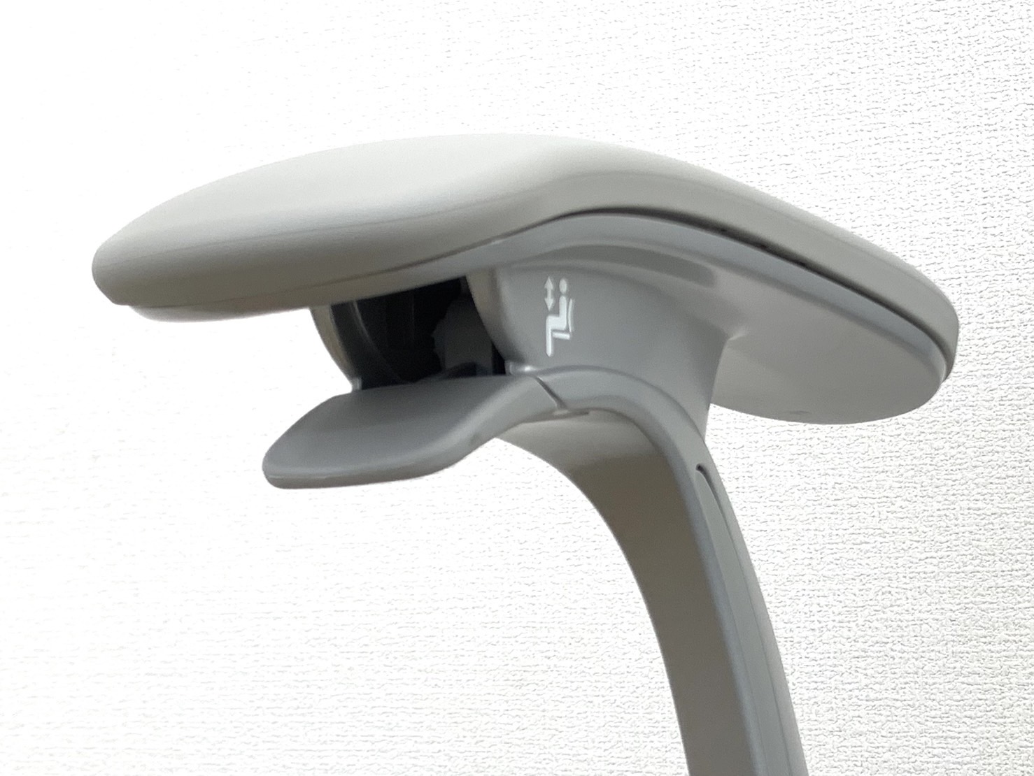 左右肘かけの裏側に操作レバーが付属しており、座りながら上下昇降とリクライニングロックの操作が可能です。