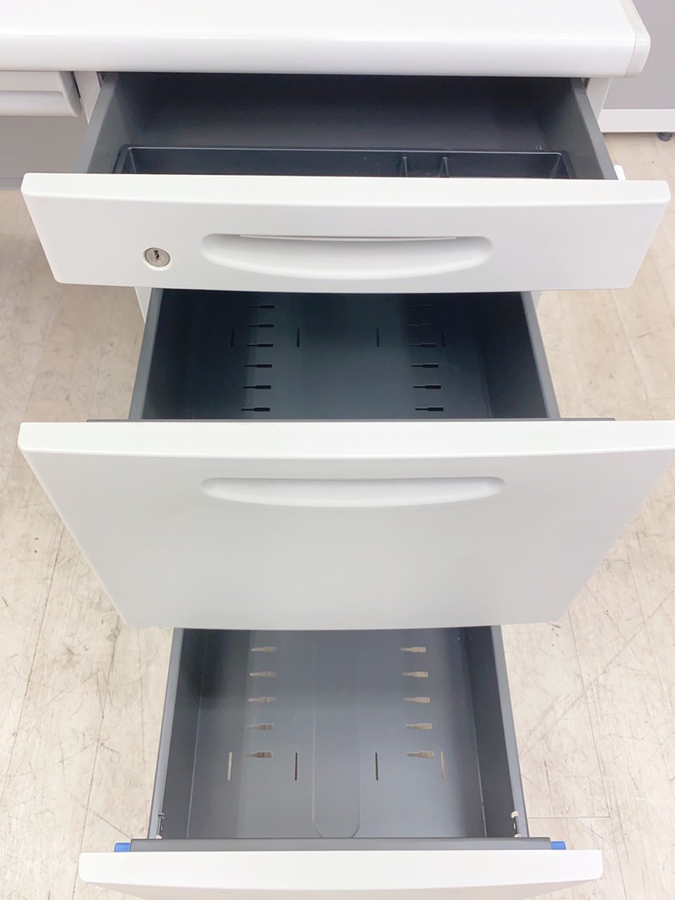 - 袖机のワゴンは、最下段がロング引出しになっており、従来より収納力120%アップ。