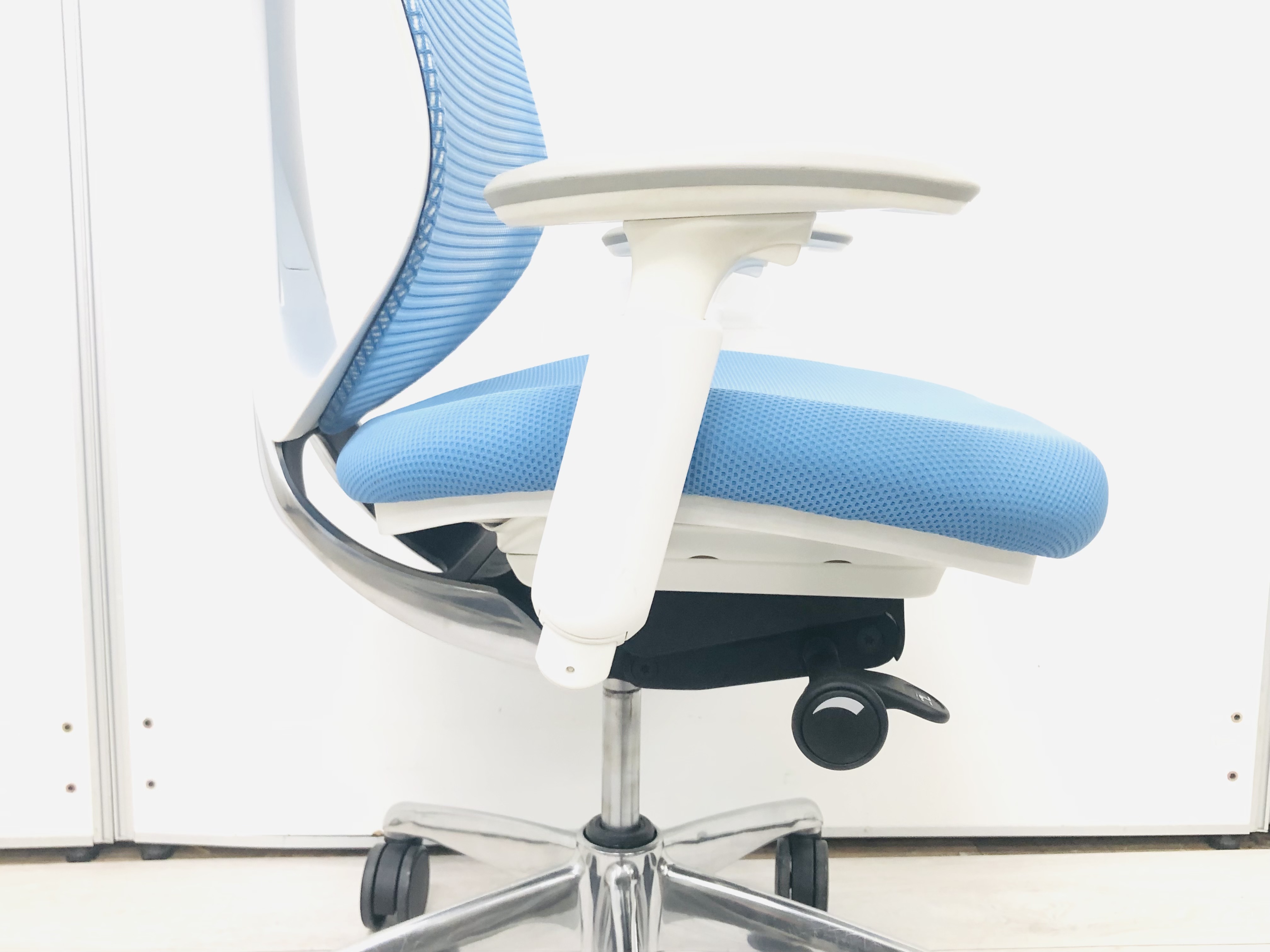 【T11】【T9】【K7】【商品入替のため、残り5脚限り】オカムラ製 サブリナシリーズ アクアブルー 背もたれ/アクアブルーx座面/ダークブルーのツートンカラー ホワイトフレーム アジャストアーム※可動肘 前傾チルト付 流れるような美しいフォルムの最高級メッシュチェア! 肘付きハイバックチェア!!