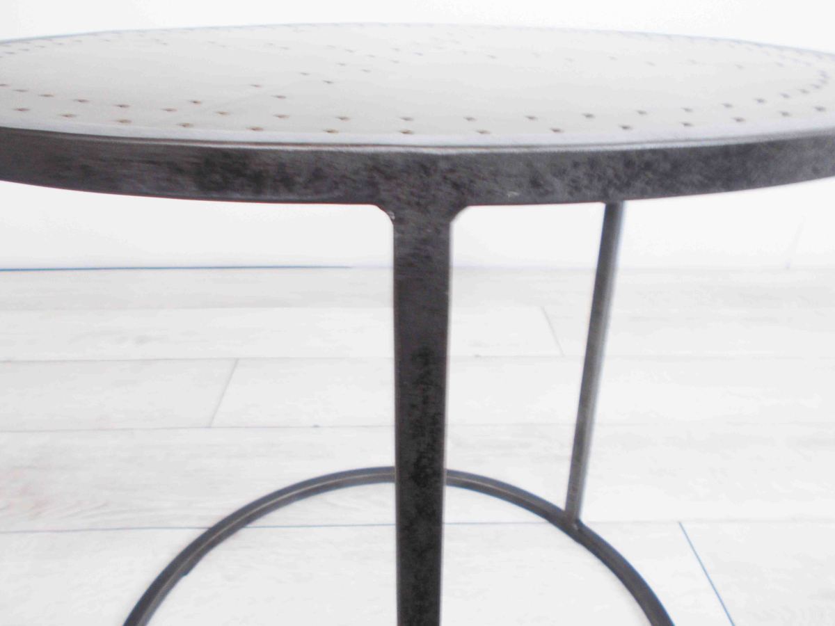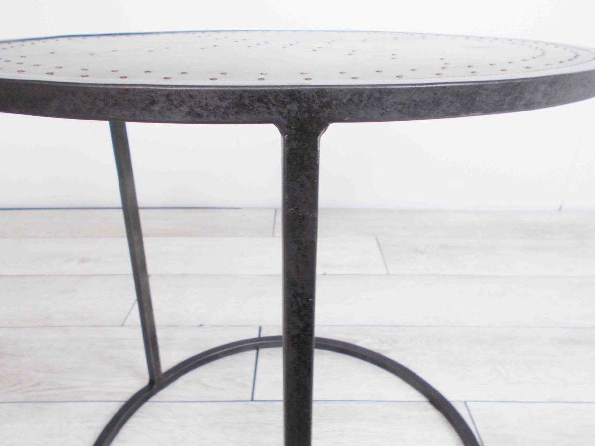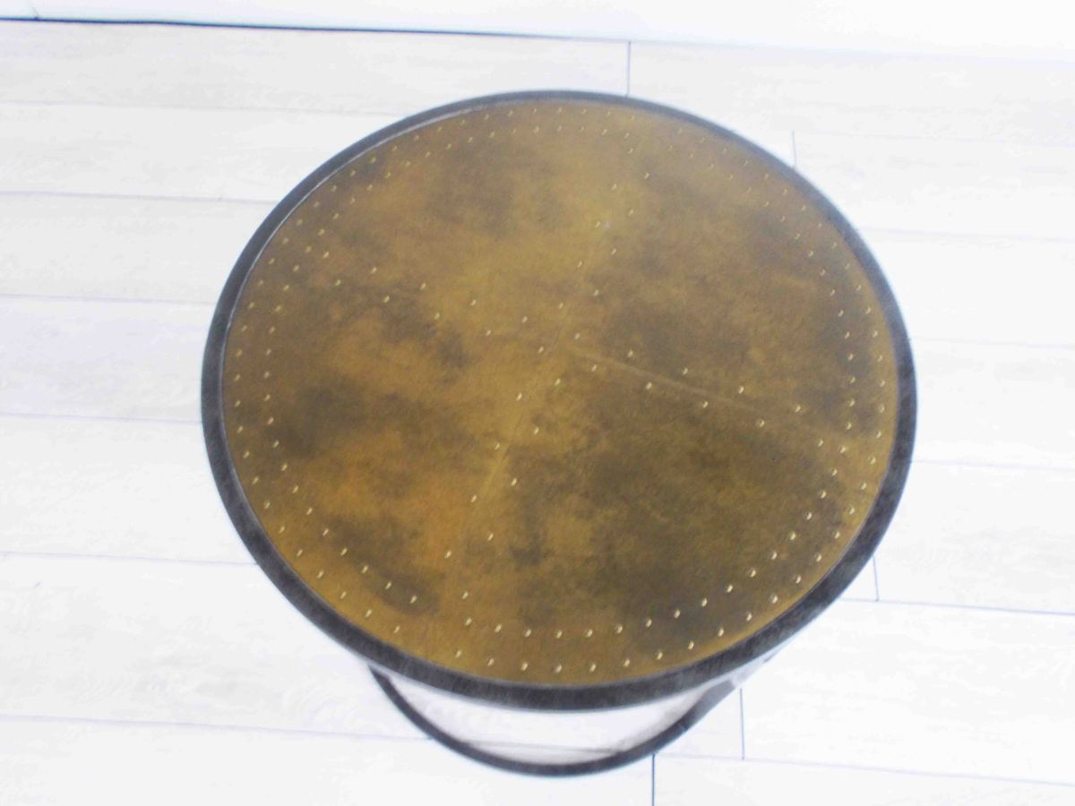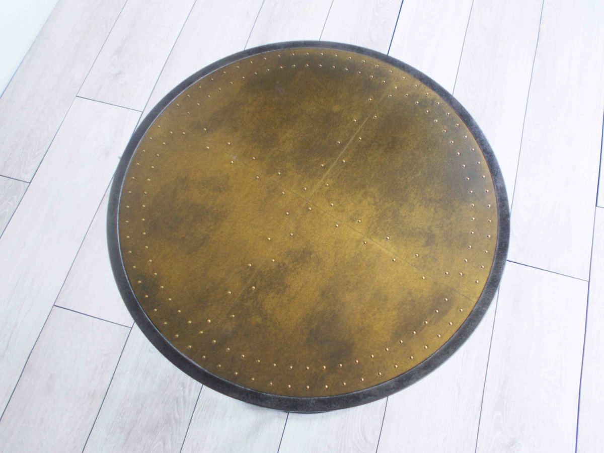 不規則な脚部のデザインにより、見る角度によって印象を変えるラウンドテーブル。天板には真鍮が張り込まれ、打ち込まれた鋲が無骨で工業的な雰囲気を高めてくれます。