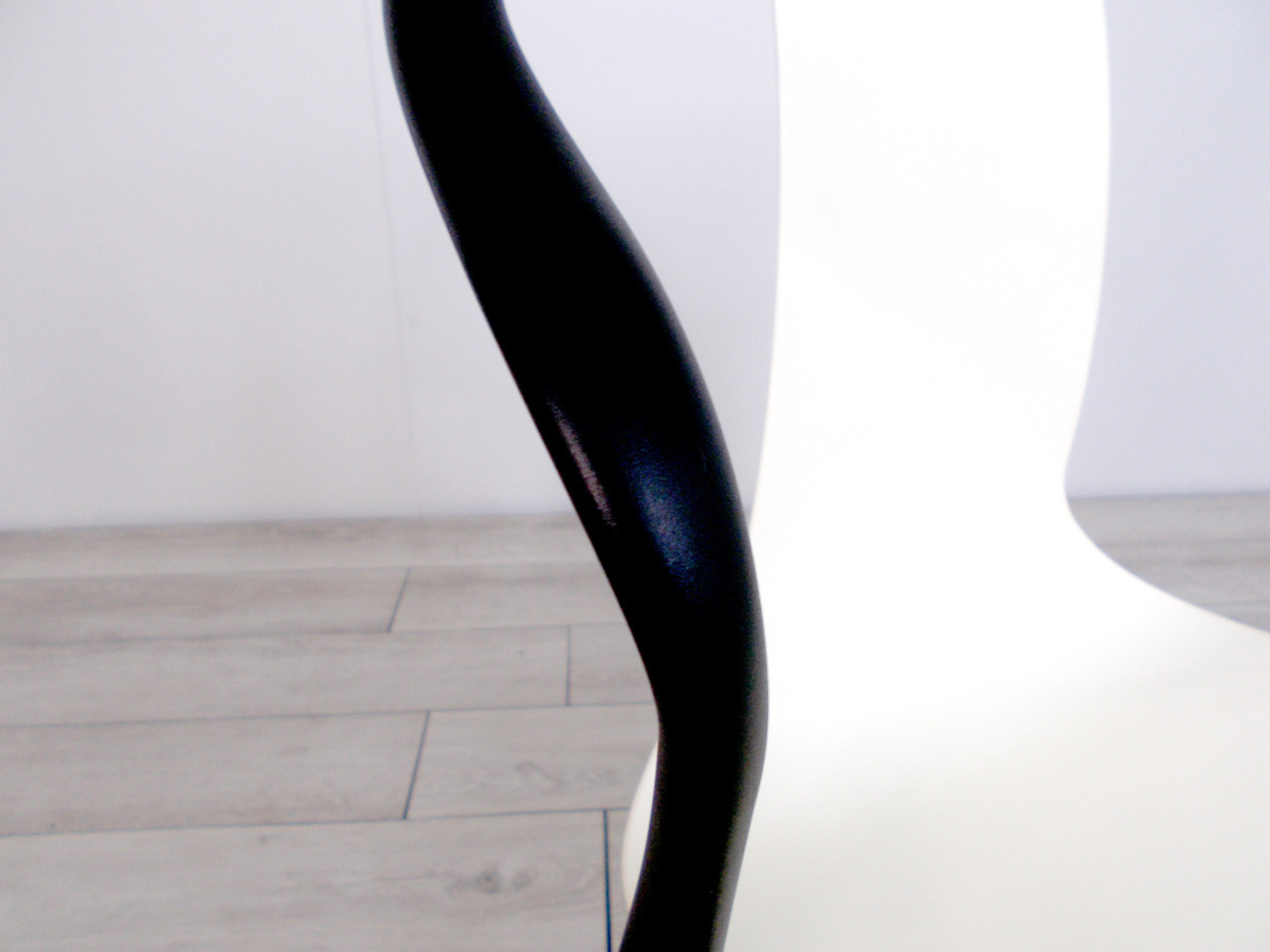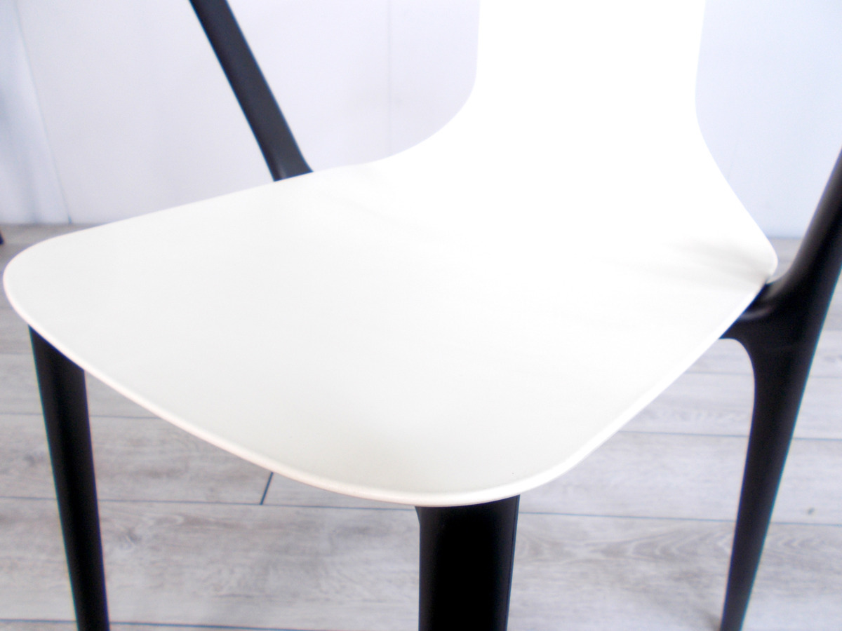 この椅子の最大の特徴はシートシェルです。シートシェルは、ベルヴィルチェアのアイデンティティとなる部分であり、素材や色に応じてイメージが変化します。スレンダーな黒のフレームは、脚や背面に向かって書道の線を思わせるようなラインを描いています。一方シートシェルは、広めの座面が背もたれにかけて細くなっていき、非常に薄いシェルを支えています。