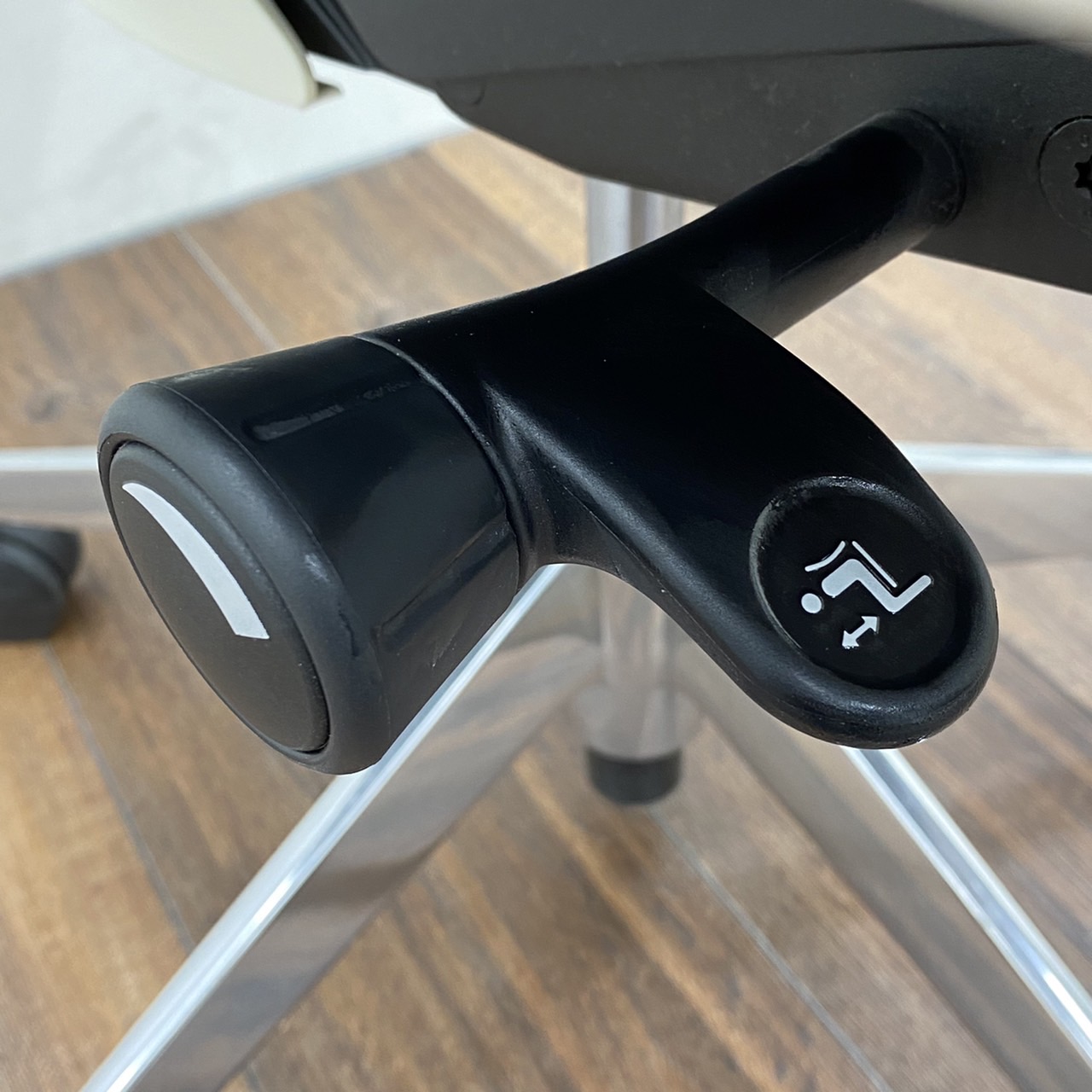 - 座面右下のダイヤル操作で、リクライニングの強弱調整が行えます。これまでのダイヤル式よりも、少ない回転数で、最弱?最強の調整が可能です。