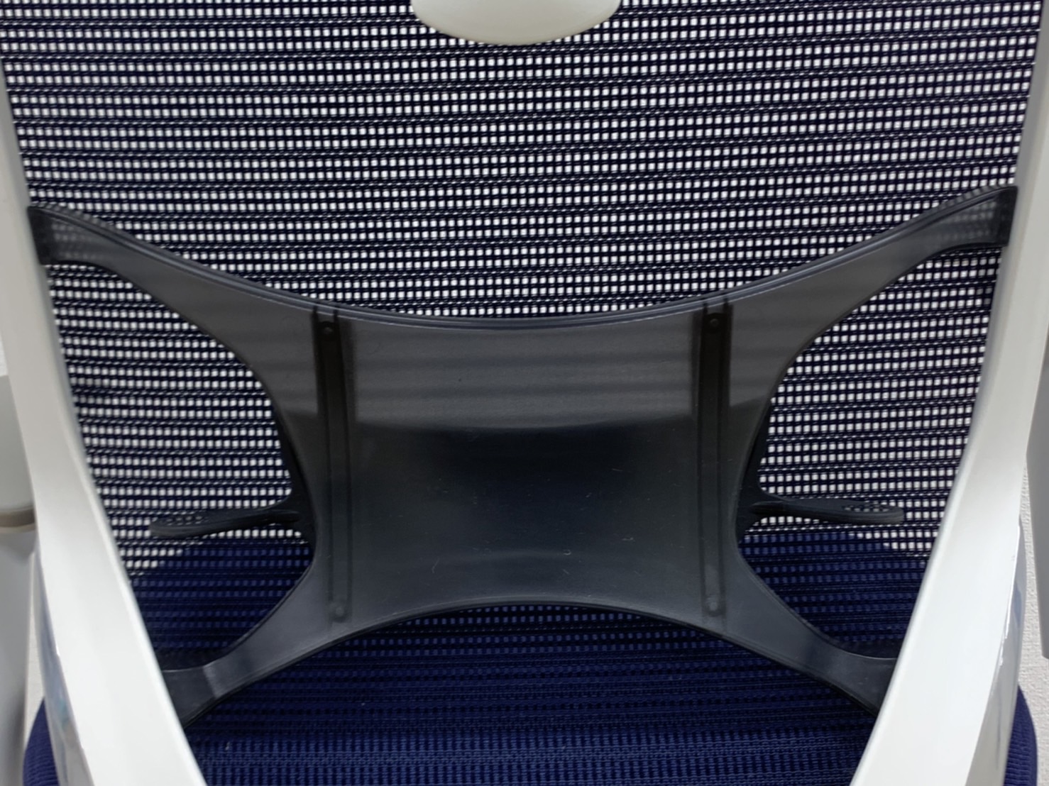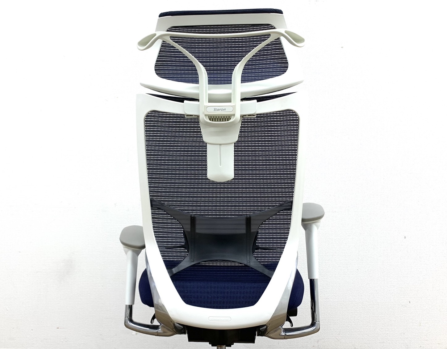 【オフィスの執務室、会議室におすすめ!】■オカムラ(okamura)製 バロン(Baron)チェア 肘付き ハイバック 背面メッシュ ■可動肘 ■ダークブルー × ホワイトシェル【硬めの座面が大人気!国産メッシュチェアの代表格!】【状態良好品!】