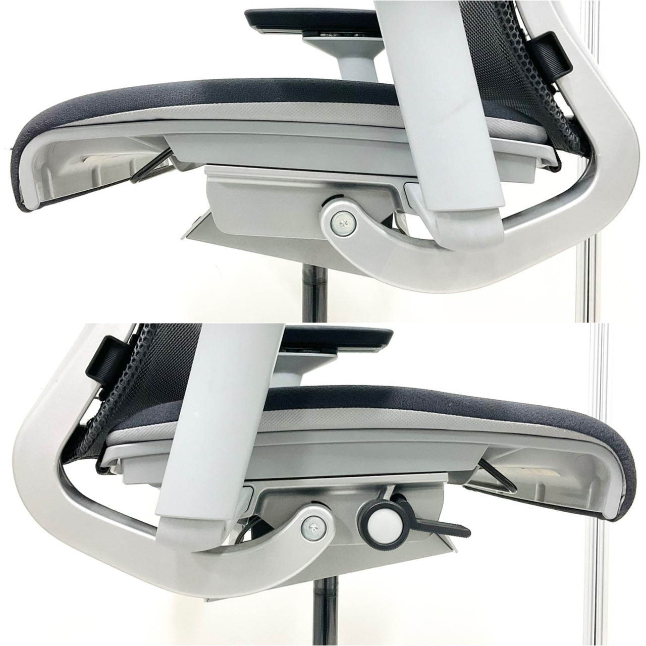 快適な座り心地に不可欠な調節機能である、上下昇降、座面の奥行き調整、リクライニングなどを備えており、操作もわかりやすく好評です。 特に、座面の奥行きは、座面下の左右に通った細いバーで調整でき、座ったままで軽やかに滑るように調整が可能です。 価格面では、新品では高めですが、中古は流通も多く、定価の3割前後の価格で高級チェアの座り心地を手に入れることができます!