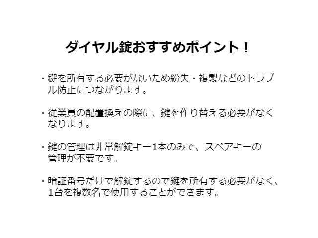 ・鍵を所有する必要がないため紛失・複製などのトラブル防止につながります。