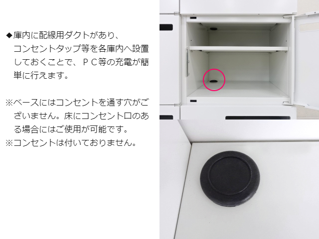 各庫内の底板には配線用のダクトがあり、コンセントをセットすると庫内でPC等の充電も行えます。