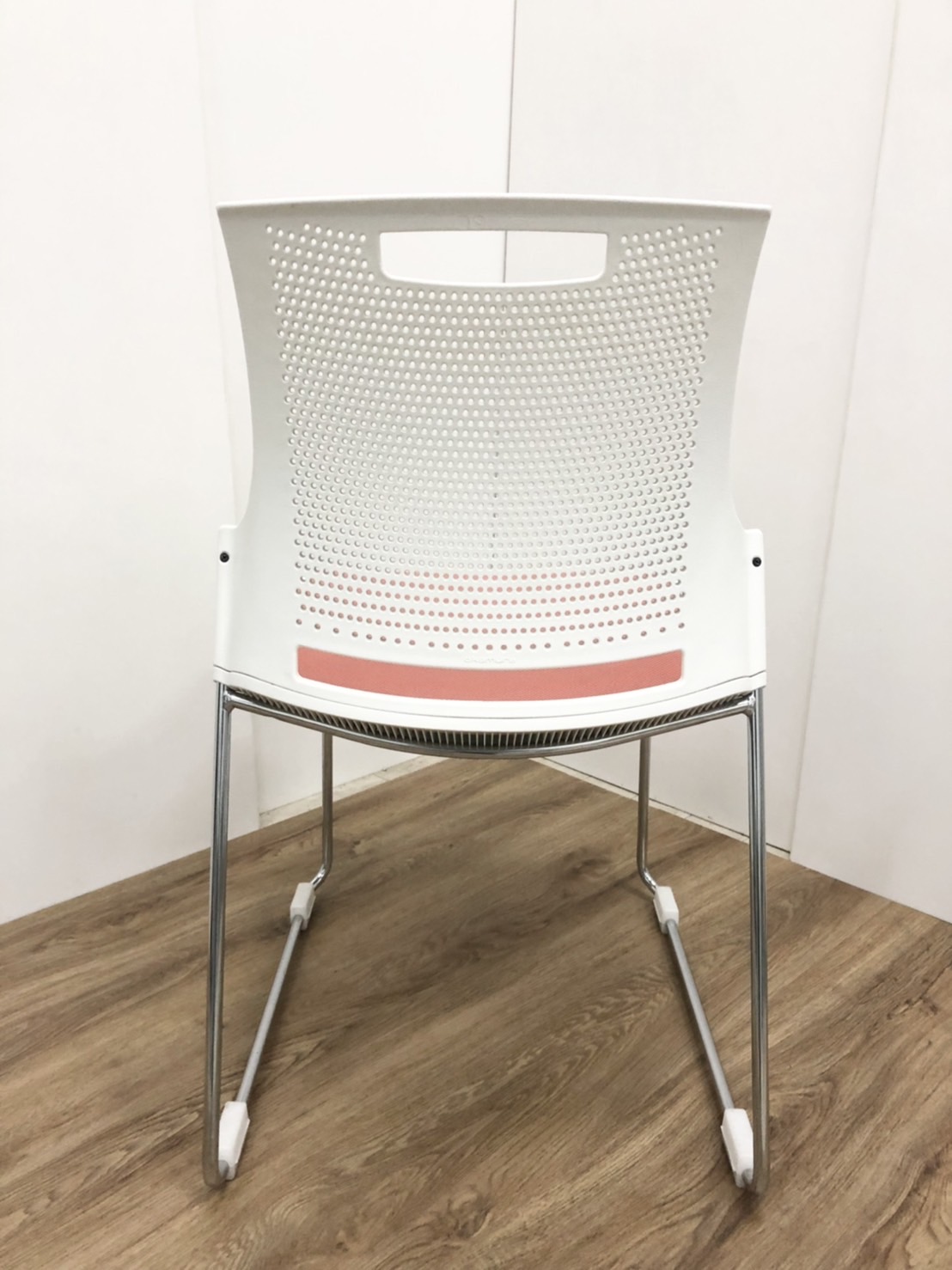 ピンクの座面と白フレームと可愛らしい見た目のスタッキングチェアです!