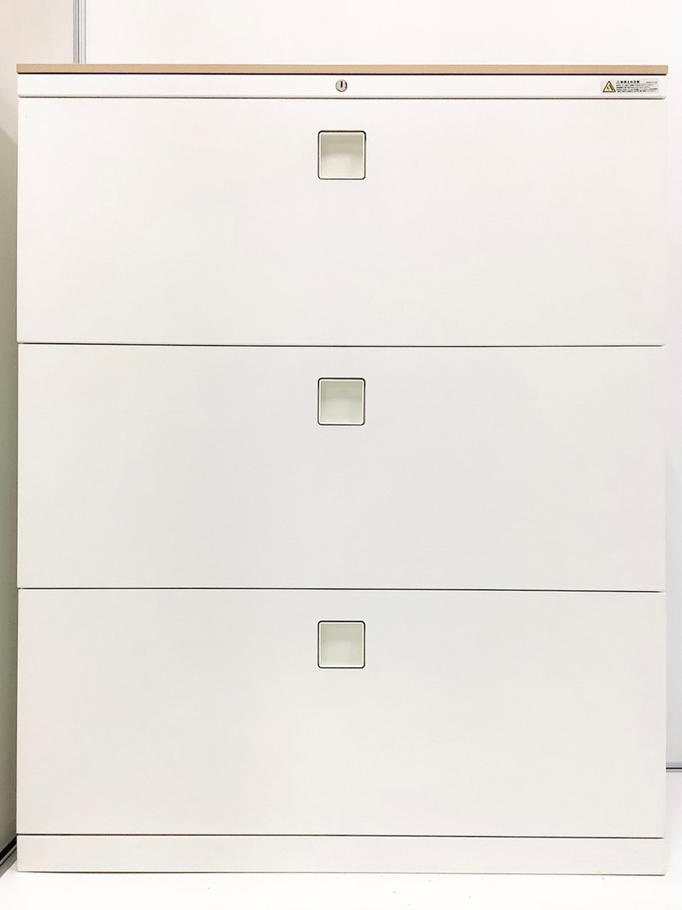 【ファイル収納にオススメ!高品質で使いやすい人気シリーズの3段ラテラル書庫!】■オカムラ(okamura)製 レクトラインシリーズ 3段ラテラル書庫 ローキャビネット H1100㎜ ■ホワイト ■シリンダー鍵 ■天板付き(天板:ホワイト) ※日焼け有