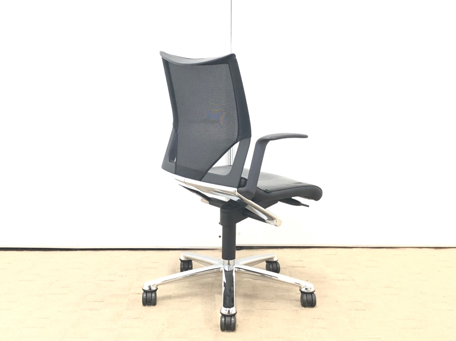 後傾20°のストローク幅でリクライニングし、座面左前下のレバーにより、