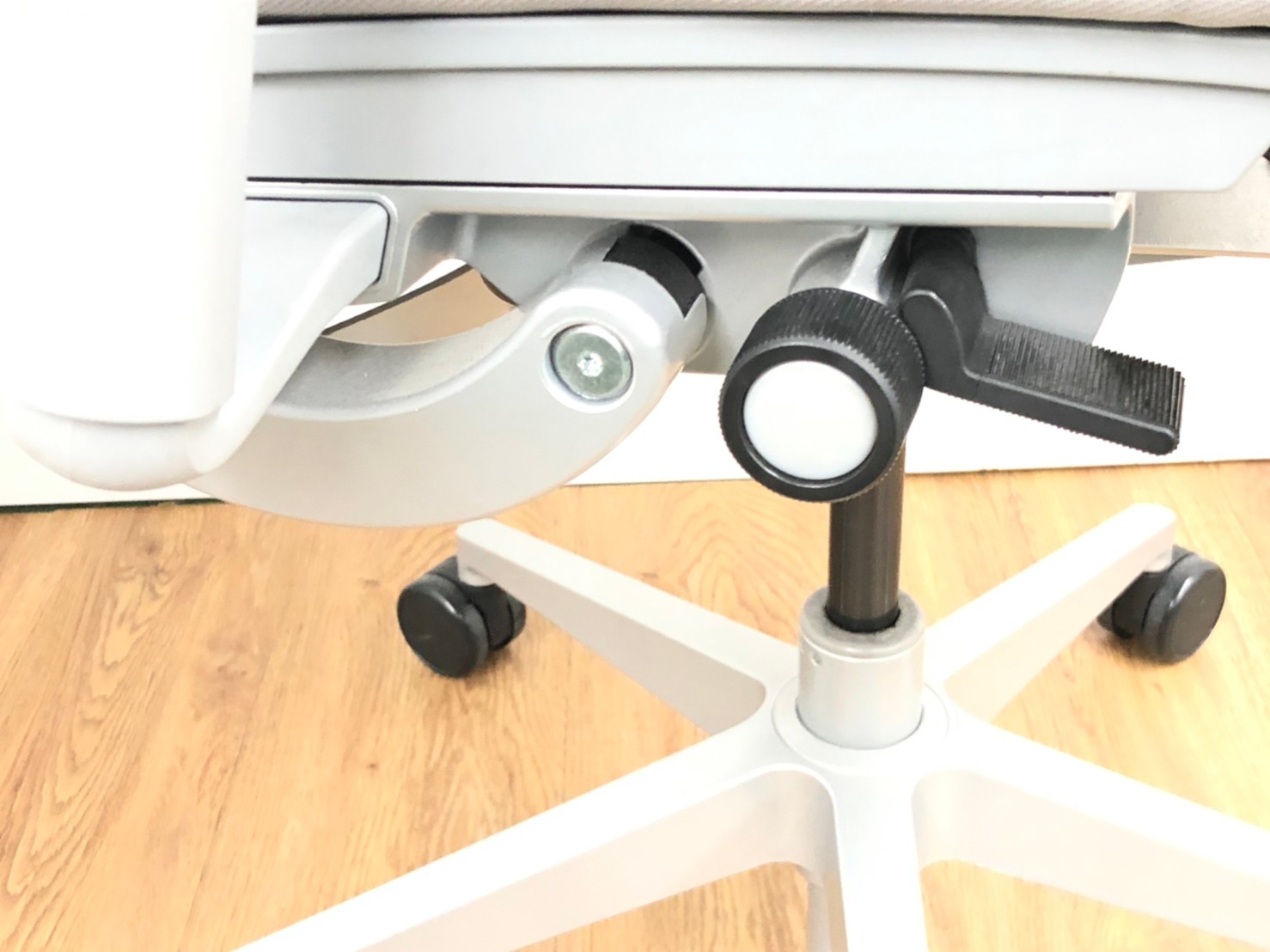 - レバーを引き上げながら座面を前後にスライドさせ、レバーを放すとロックします。背もたれに身体をつけた状態で膝の裏側と座面のエッジの間に5-8センチほどの隙間ができるのが理想的です。
