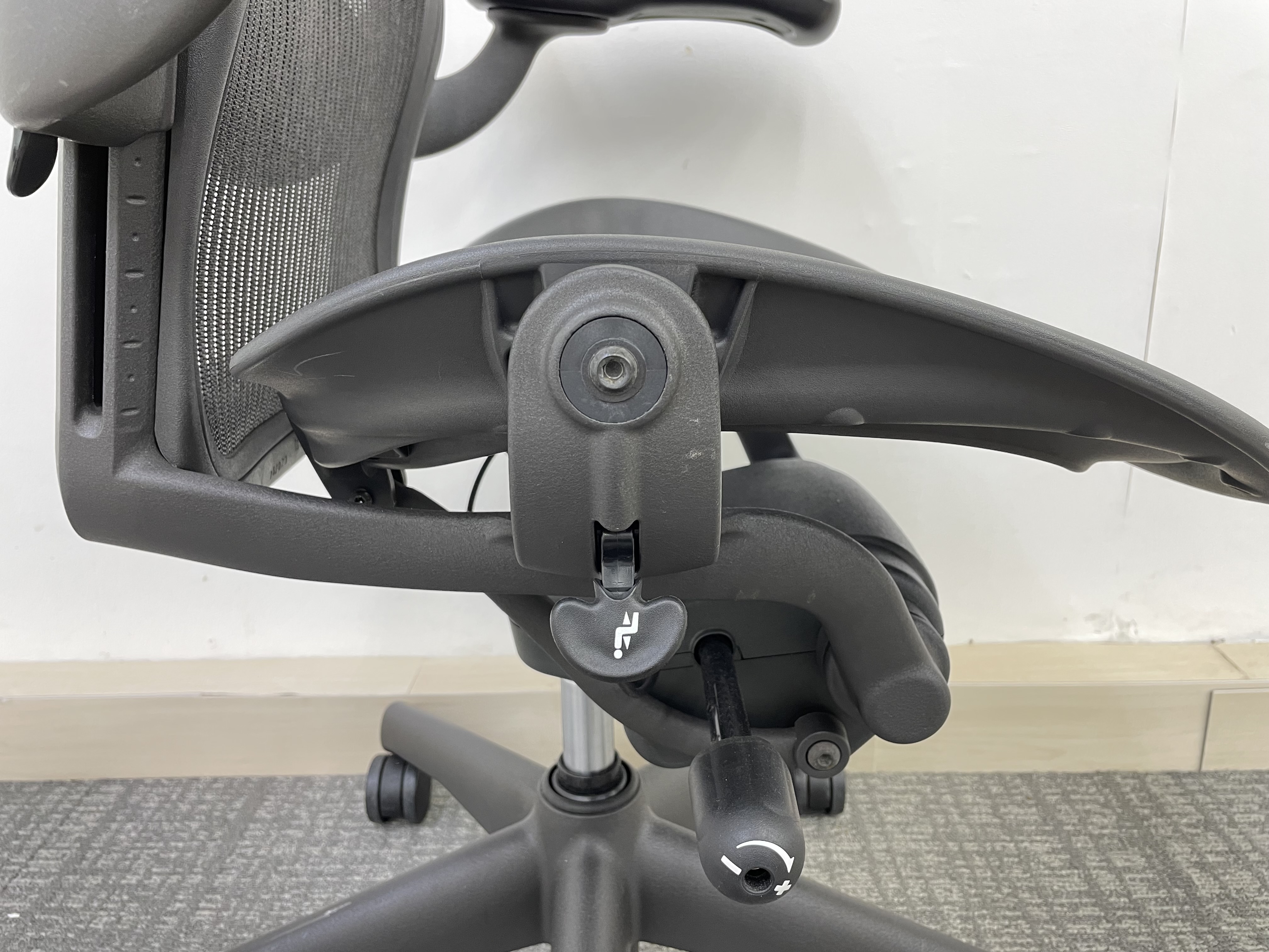 - ノブを+方向に回すと背もたれのリクライニング が硬くなり、-方向に回すと柔らかくなります。