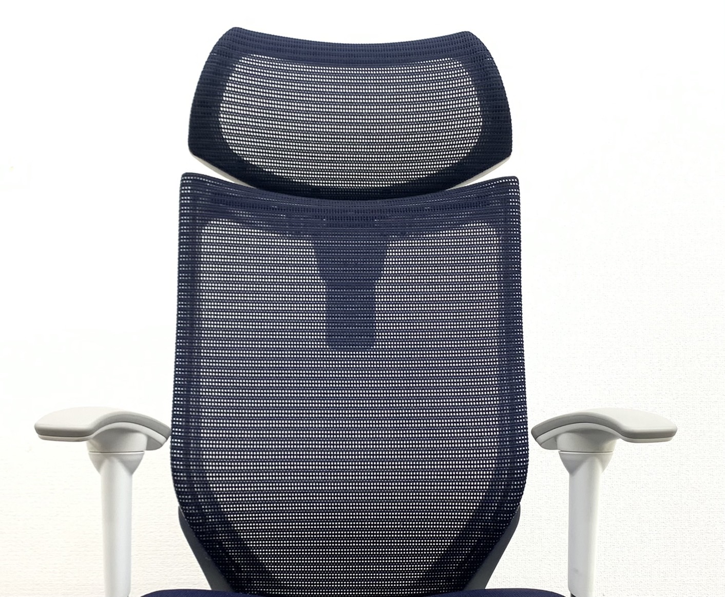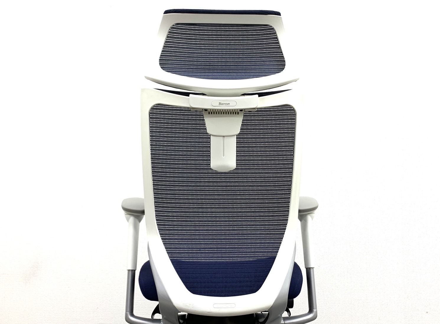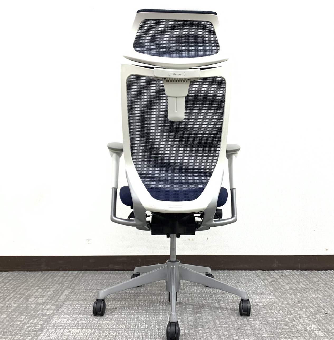【オフィスの執務室、会議室におすすめ!】■オカムラ(okamura)製 バロン(Baron)チェア 肘付き ハイバック 背面メッシュ ■可動肘 ■ダークブルー × ホワイトシェル【硬めの座面が大人気!国産メッシュチェアの代表格!】【状態良好品!】