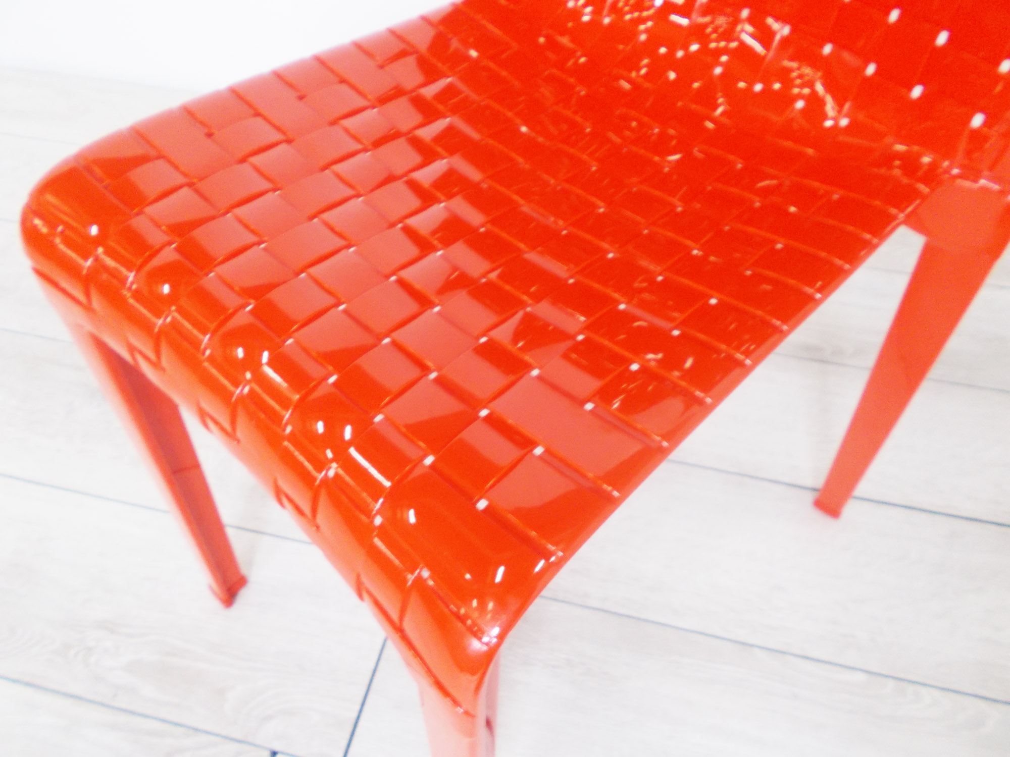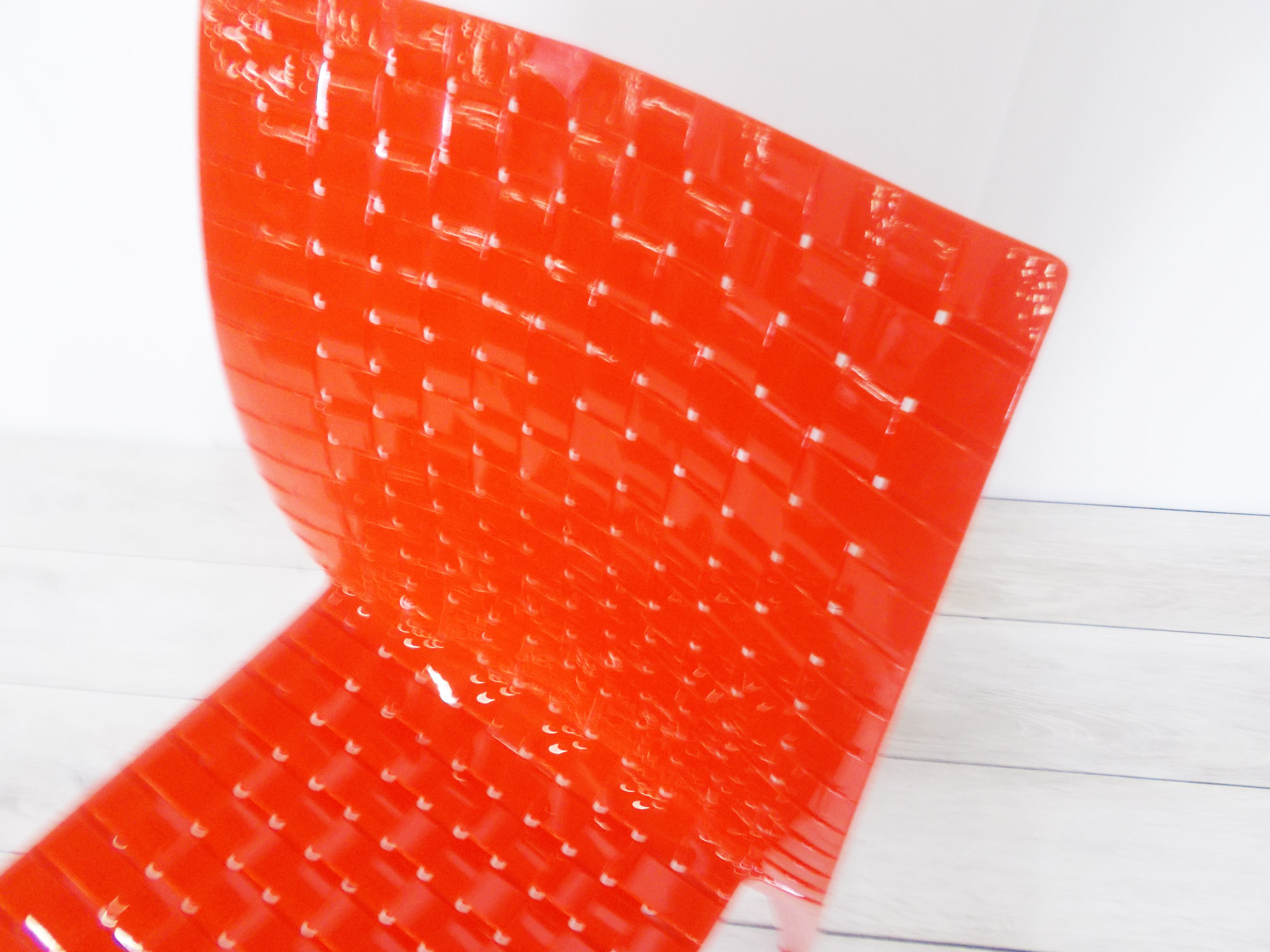 イタリアの『カルテル』社による、吉岡徳仁がデザイン『AmiAmi(アミアミ)』です。イタリアン織物のような視覚効果をもたらすAmi Amiチェア。射出成形で型を取ったことで、革を編んでいるかのように見る立体的な凹凸とポリカーボネートならではの透明感は、光を受けて陰影を創り出し見た目にも美しいチェアとなりますです。