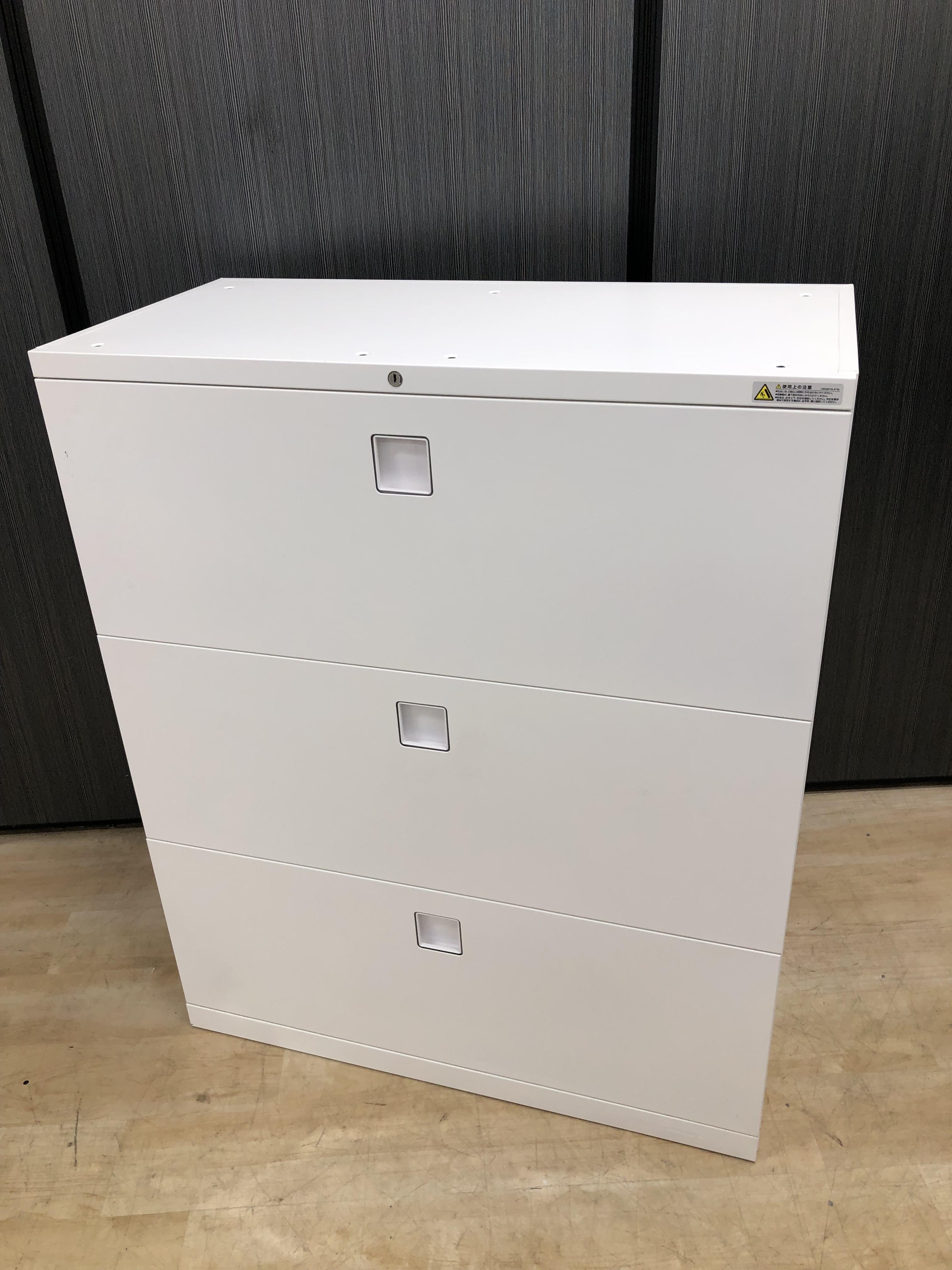 オカムラ レクトライン 3段ラテラル書庫 ホワイト天板 シリンダー錠 鍵付き ※取っ手部分に若干日焼けあり