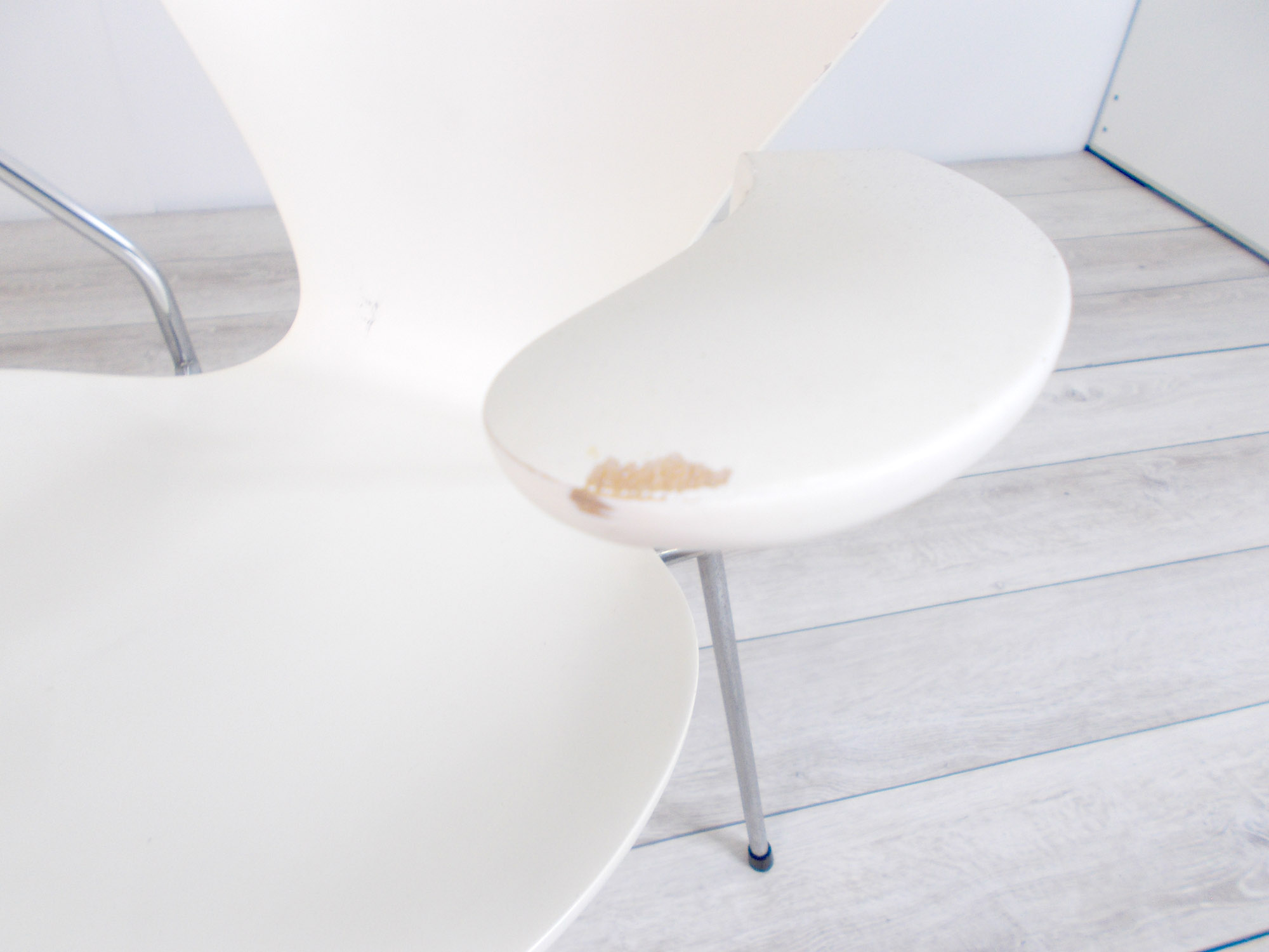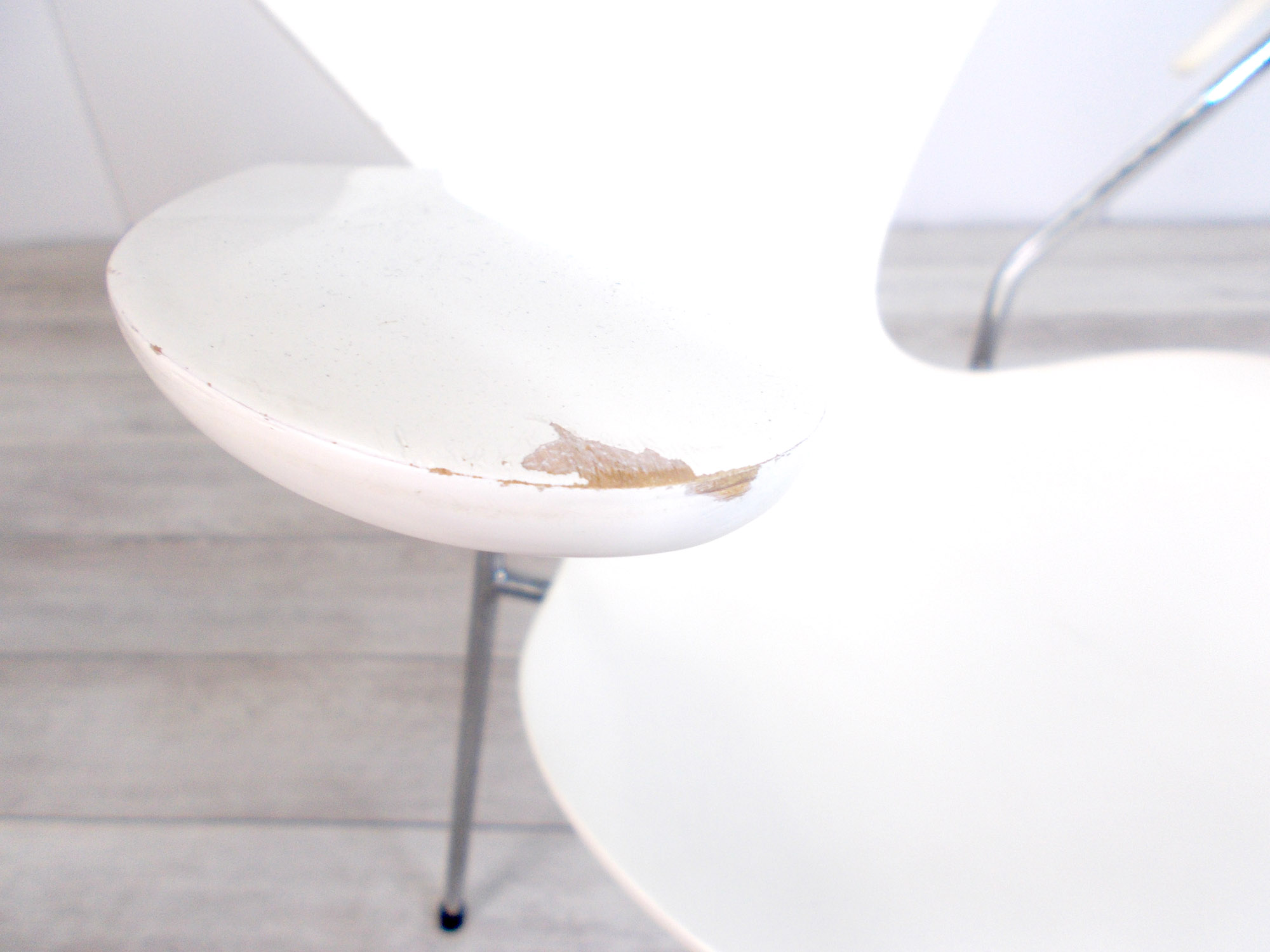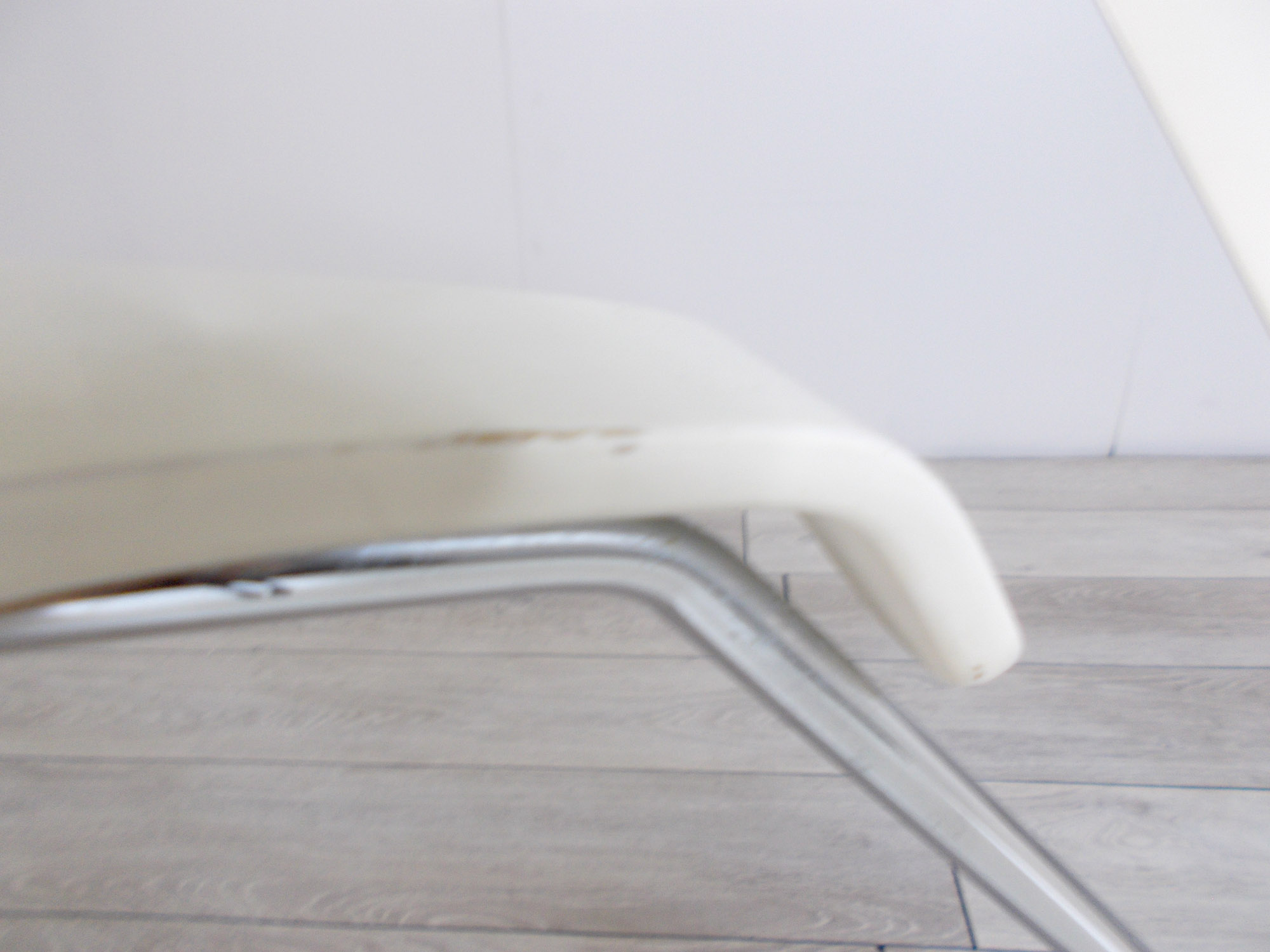 - かなり強い濃い黄ばみ・変色が商品全体にある。(例、座面・背もたれ、脚部等にある。)