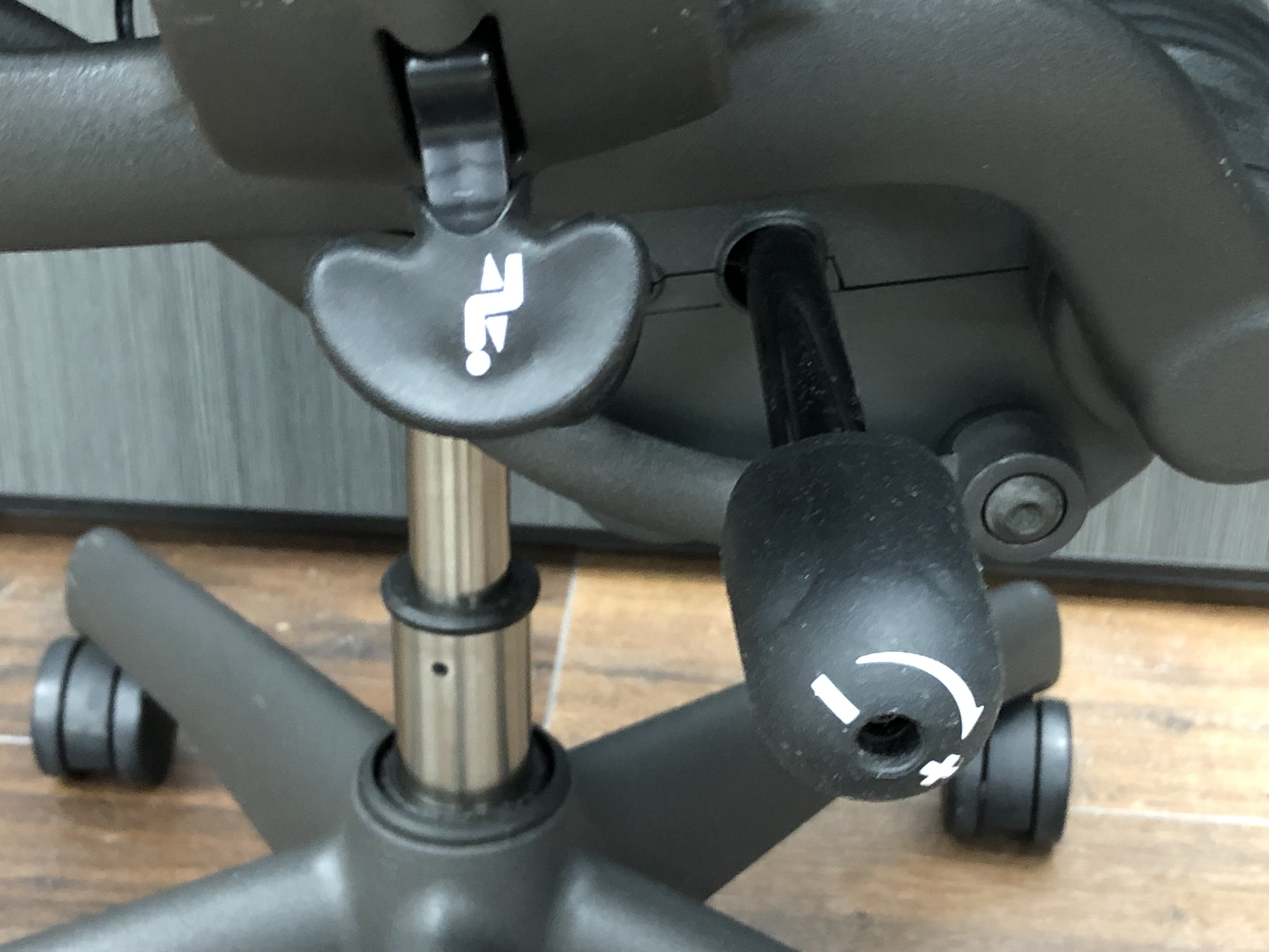 - ノブを+方向に回すと背もたれのリクライニング が硬くなり、-方向に回すと柔らかくなります。