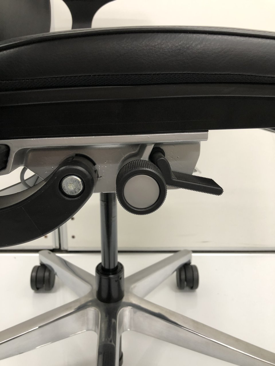 快適な座り心地に不可欠な調節機能である、上下昇降、座面の奥行き調整、リクライニングなどを備えており、操作もわかりやすく好評です。 特に、座面の奥行きは、座面下の左右に通った細いバーで調整でき、座ったままで軽やかに滑るように調整が可能です。 価格面では、新品では高めですが、中古は流通も多く、定価の3割前後の価格で高級チェアの座り心地を手に入れることができます!