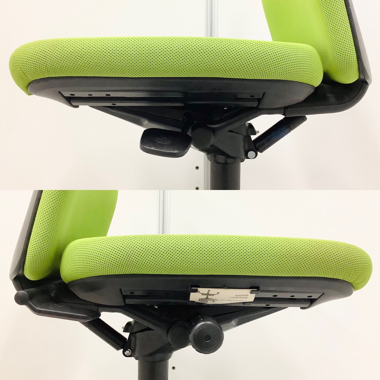 もう一つは、オカムラ社独自の""異硬度クッション""が座面に採用されていることです。これは座面が位置により異なる硬さのウレタンでできており、前方は腿裏を圧迫しないようソフトに、後方はしっかりと体重を支えるために少し硬めに作られています。クッション性とホールド感の両立により、長時間の作業での疲れを軽減してくれます。"