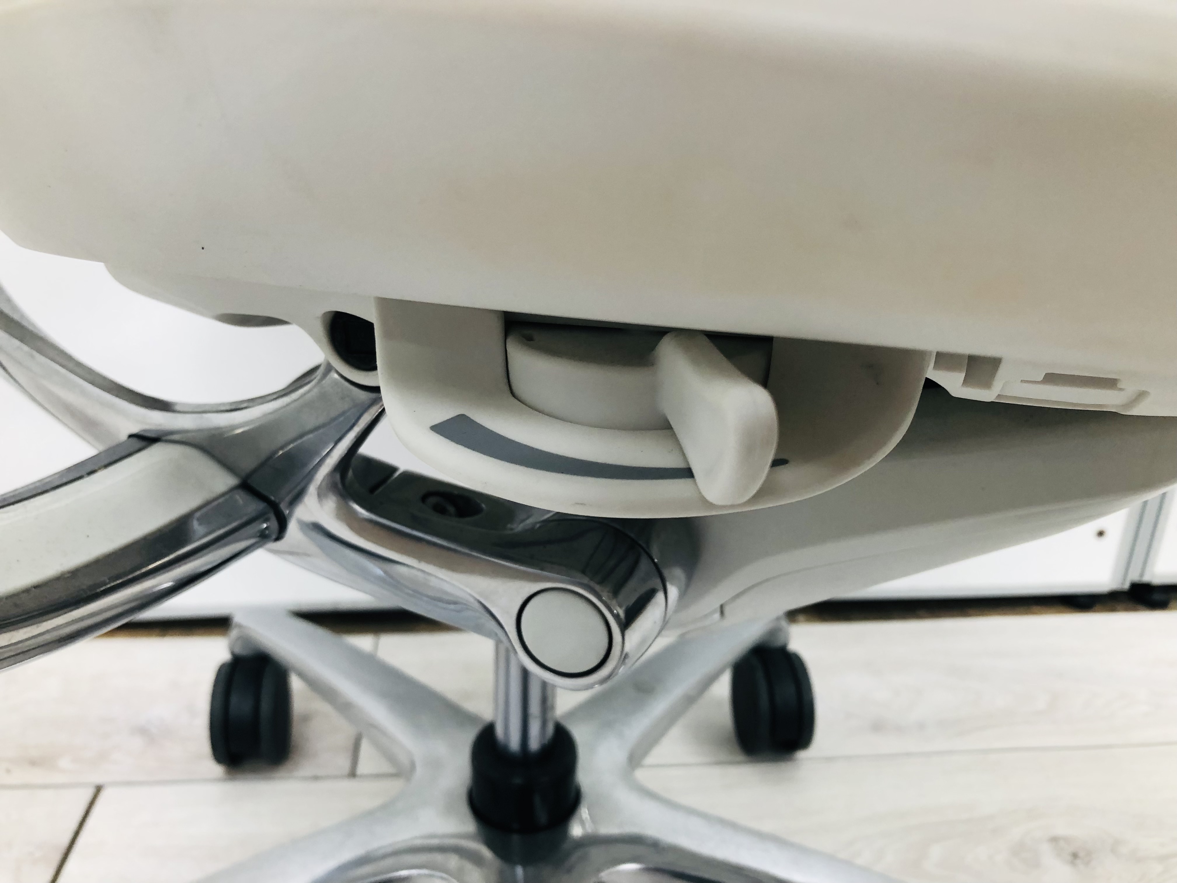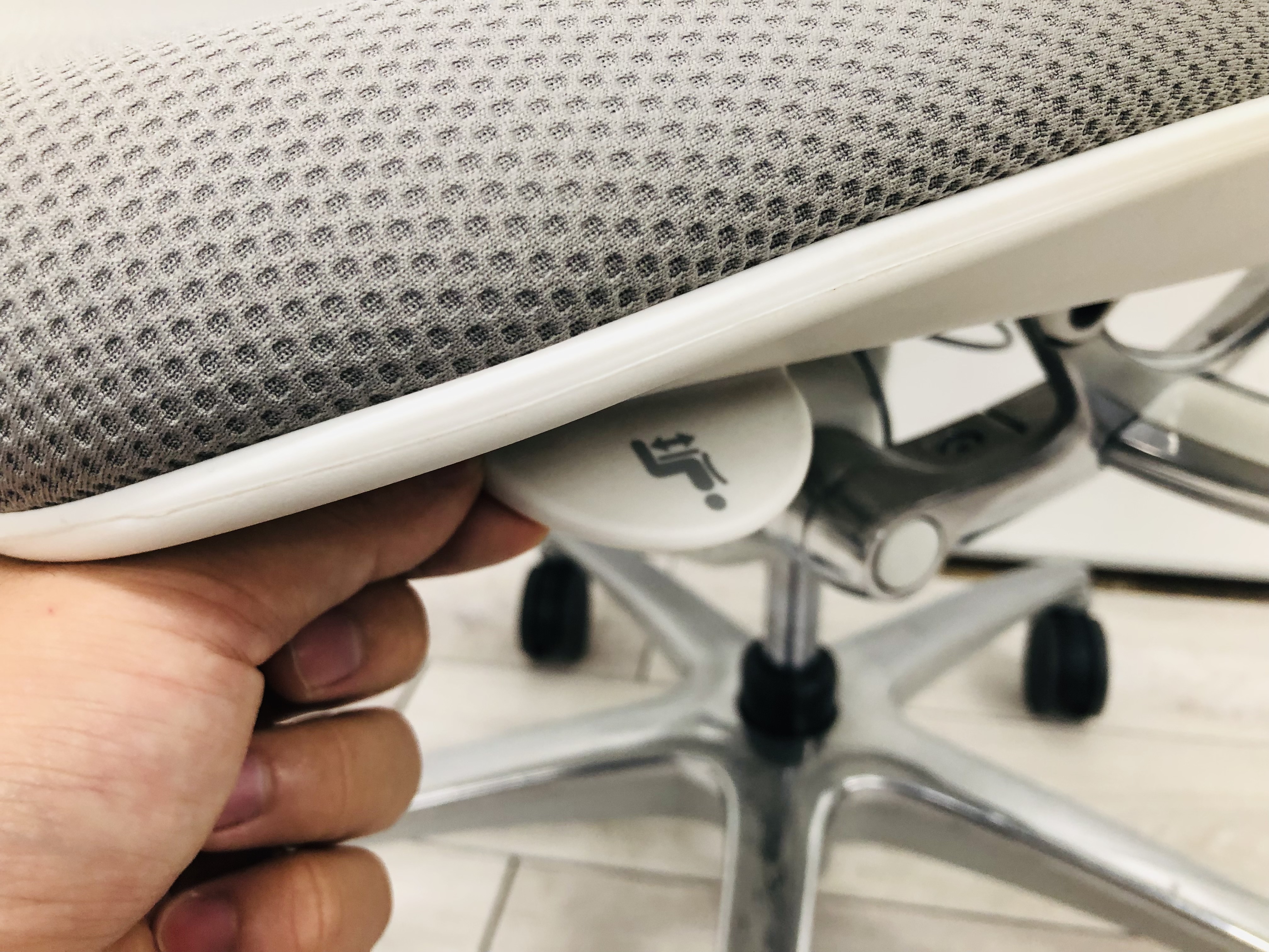 - 椅子と背が連動する「シンクロリクライニング」。リクライニング角度は直立ポジションから前方に10度、後方に23度です。
