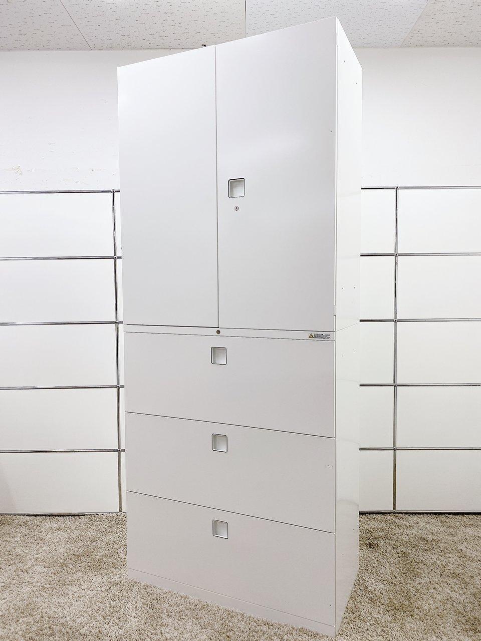 スライド式の扉+引き出しタイプの便利な書庫セットが入荷!使い勝手抜群のハイキャビネットが入荷! ■オカムラ/レクトライン/ホワイト 2枚引き戸+3段ラテラルキャビネット