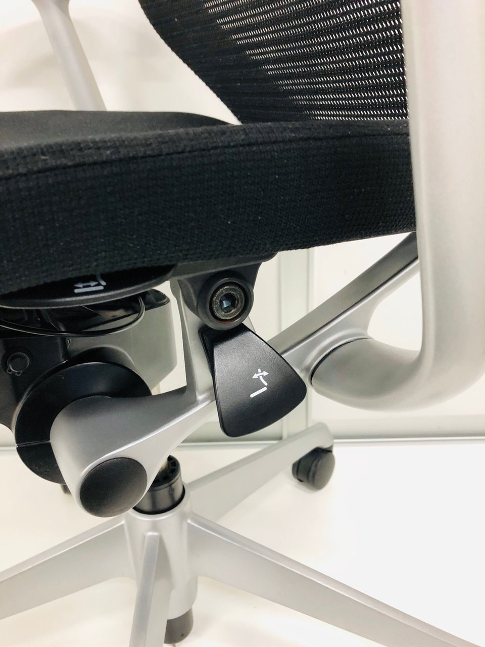 座面のすぐ右下にあるレバーの操作により、座面位置の上下調整(100mm)が可能です。
