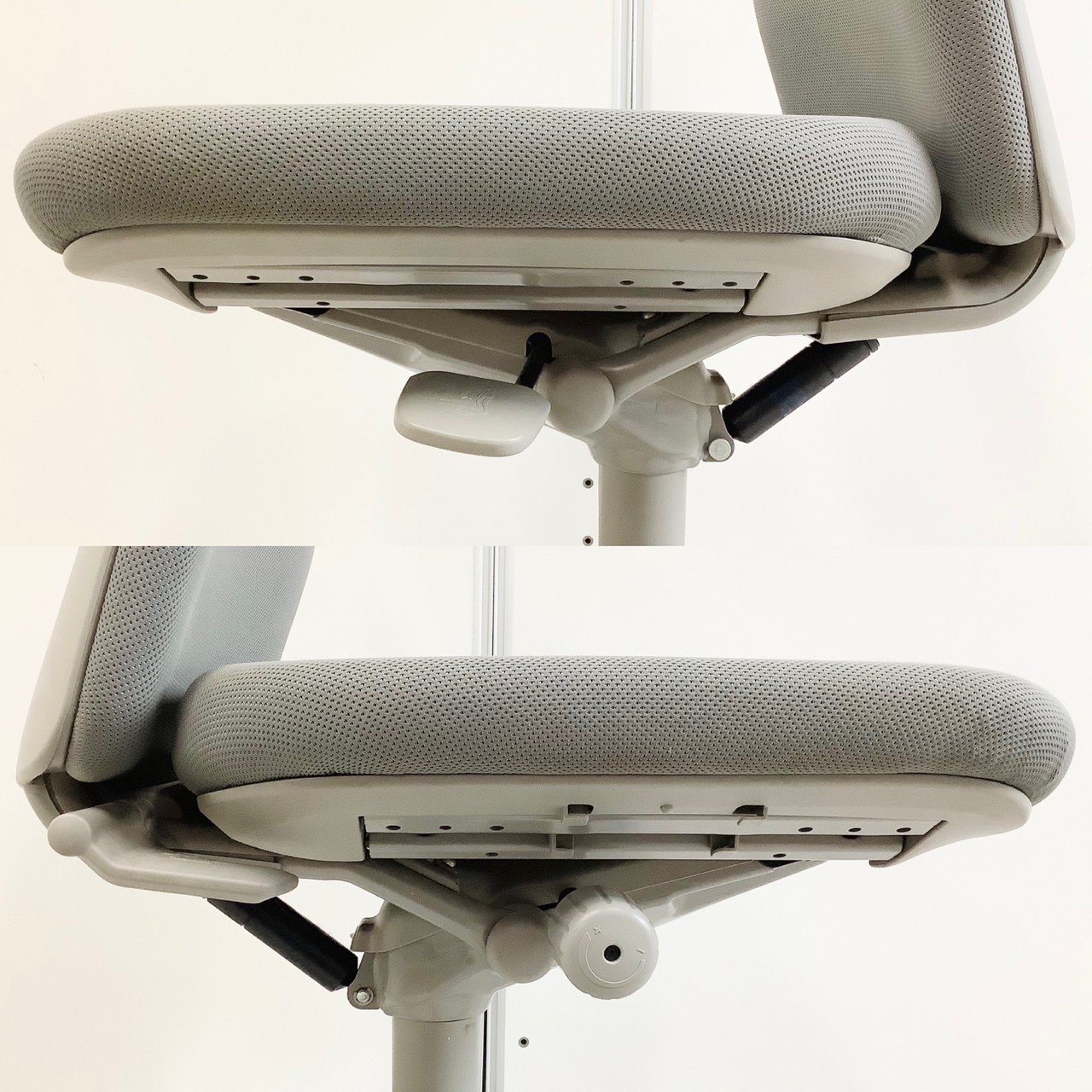 もう一つは、オカムラ社独自の""異硬度クッション""が座面に採用されていることです。これは座面が位置により異なる硬さのウレタンでできており、前方は腿裏を圧迫しないようソフトに、後方はしっかりと体重を支えるために少し硬めに作られています。クッション性とホールド感の両立により、長時間の作業での疲れを軽減してくれます。"