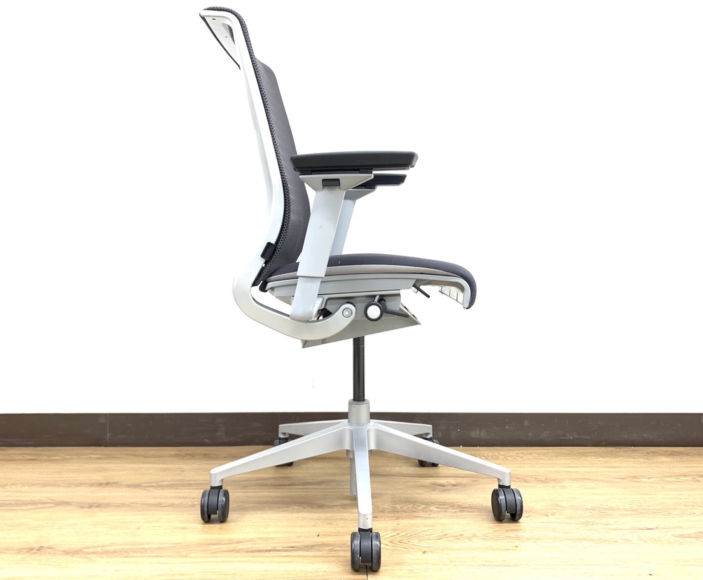 快適な座り心地に不可欠な調節機能である、上下昇降、座面の奥行き調整、リクライニングなどを備えており、操作もわかりやすく好評です。 特に、座面の奥行きは、座面下の左右に通った細いバーで調整でき、座ったままで軽やかに滑るように調整が可能です。 価格面では、新品では高めですが、中古は流通も多く、定価の3割前後の価格で高級チェアの座り心地を手に入れることができます!