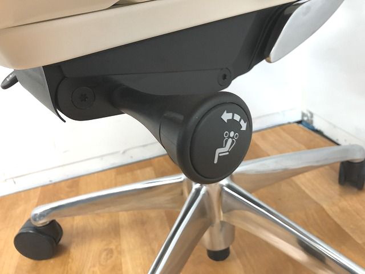 - 椅子と背が連動する「シンクロリクライニング」。リクライニング角度は直立ポジションから前方に10度、後方に23度です。