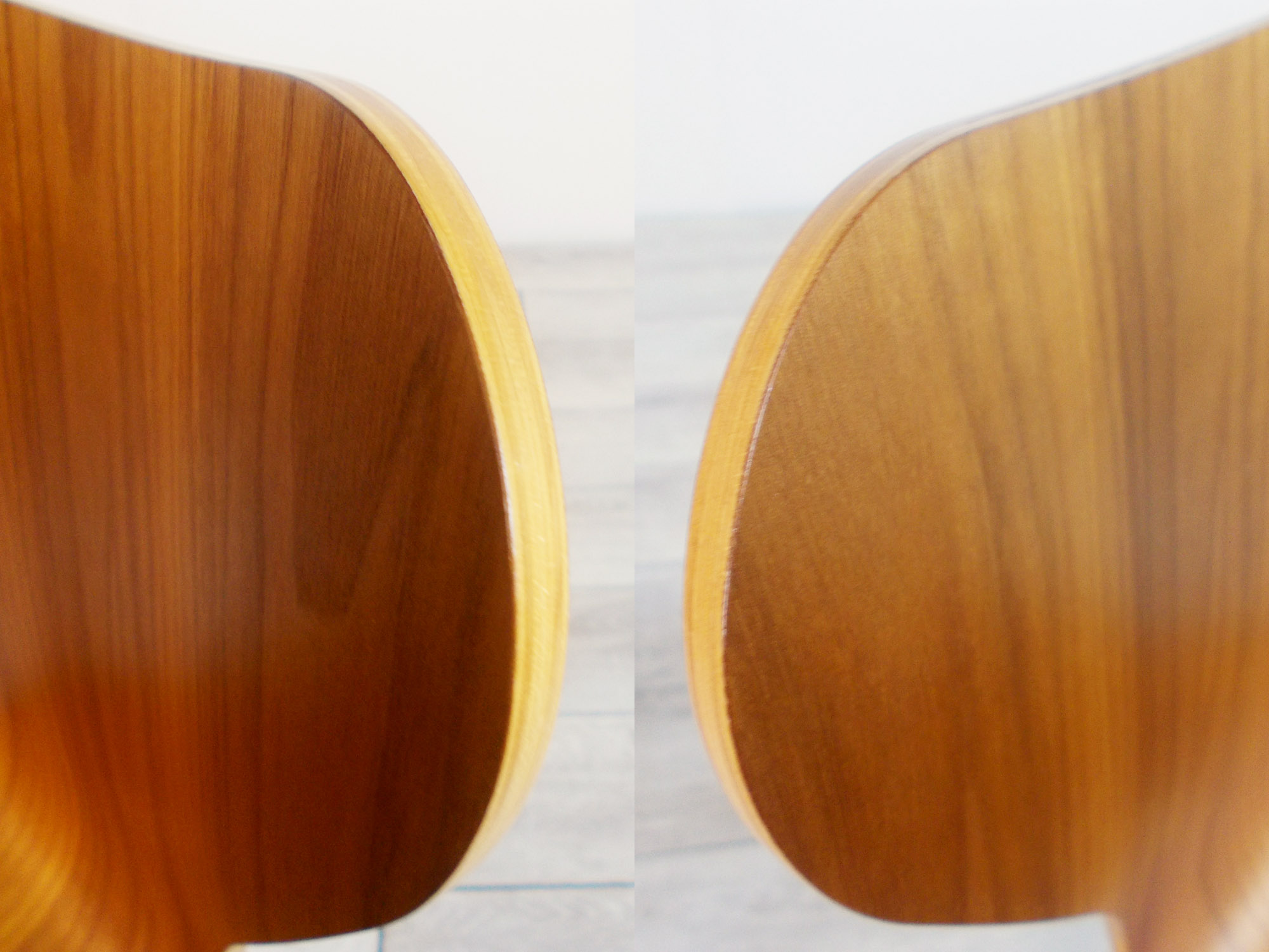 ラミネート技術の集大成ともいえる成形合板のシェルとスタッキング可能な4本脚のベースを組み合わせています。