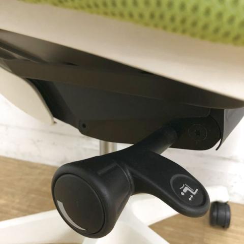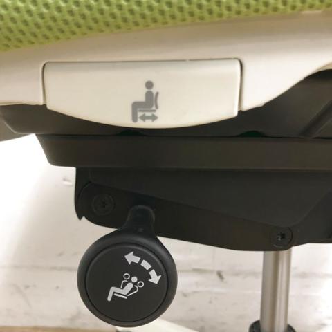 - 座面右下のダイヤル操作で、リクライニングの強弱調整が行えます。これまでのダイヤル式よりも、少ない回転数で、最弱?最強の調整が可能です。
