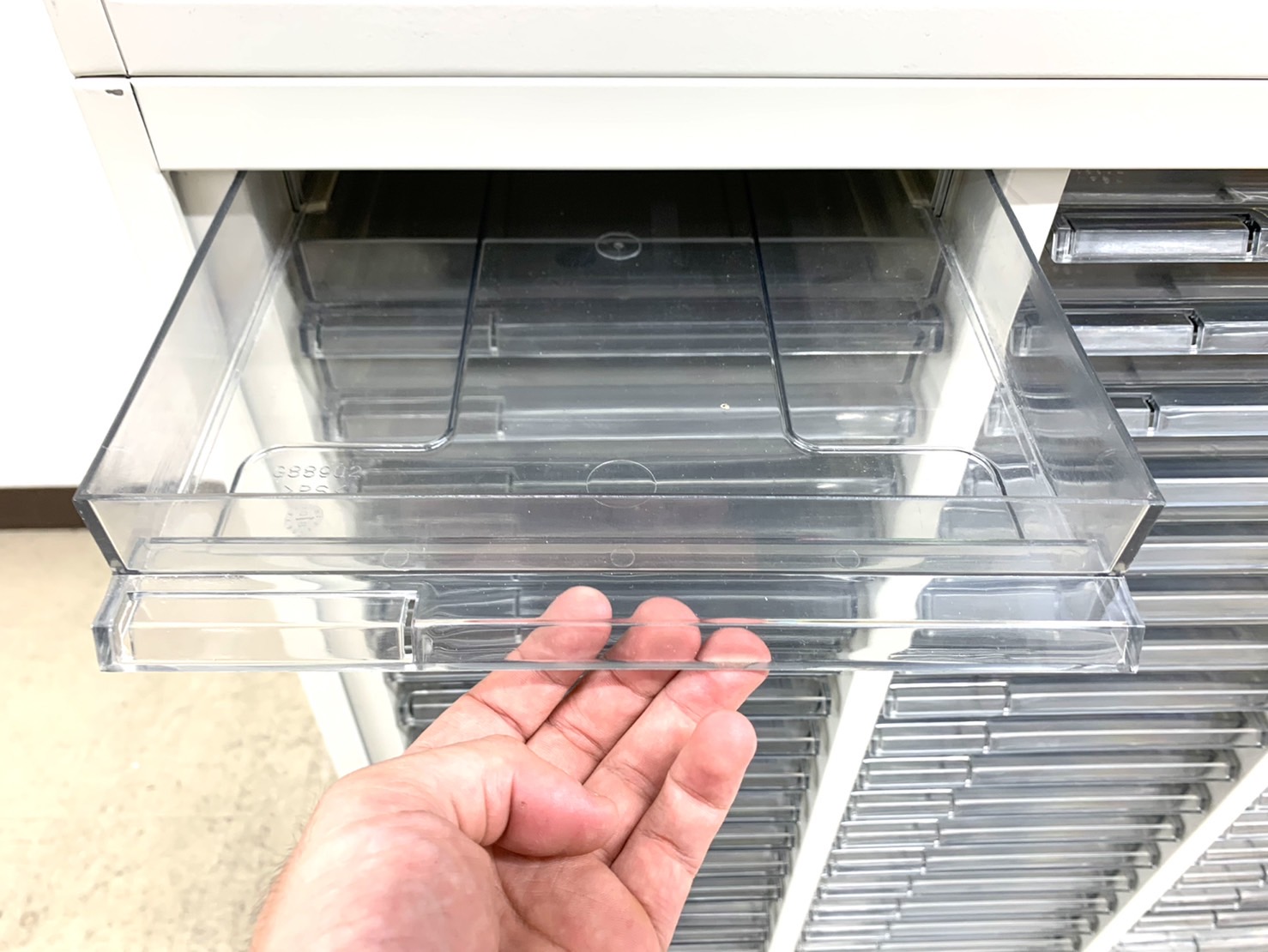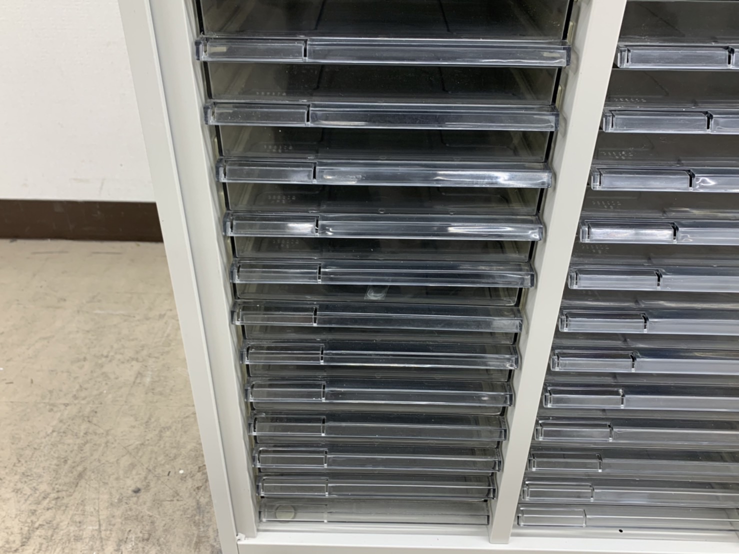 クリスタルトレーは約3cmで薄型引き出しがた〜くさん付属したキャビネットです!たくさんの書類や契約書、パンフレットを仕分けて収納が可能です。上下ともにスチール素材、ガッチリとした頑丈な造りでまさにオフィスユース!