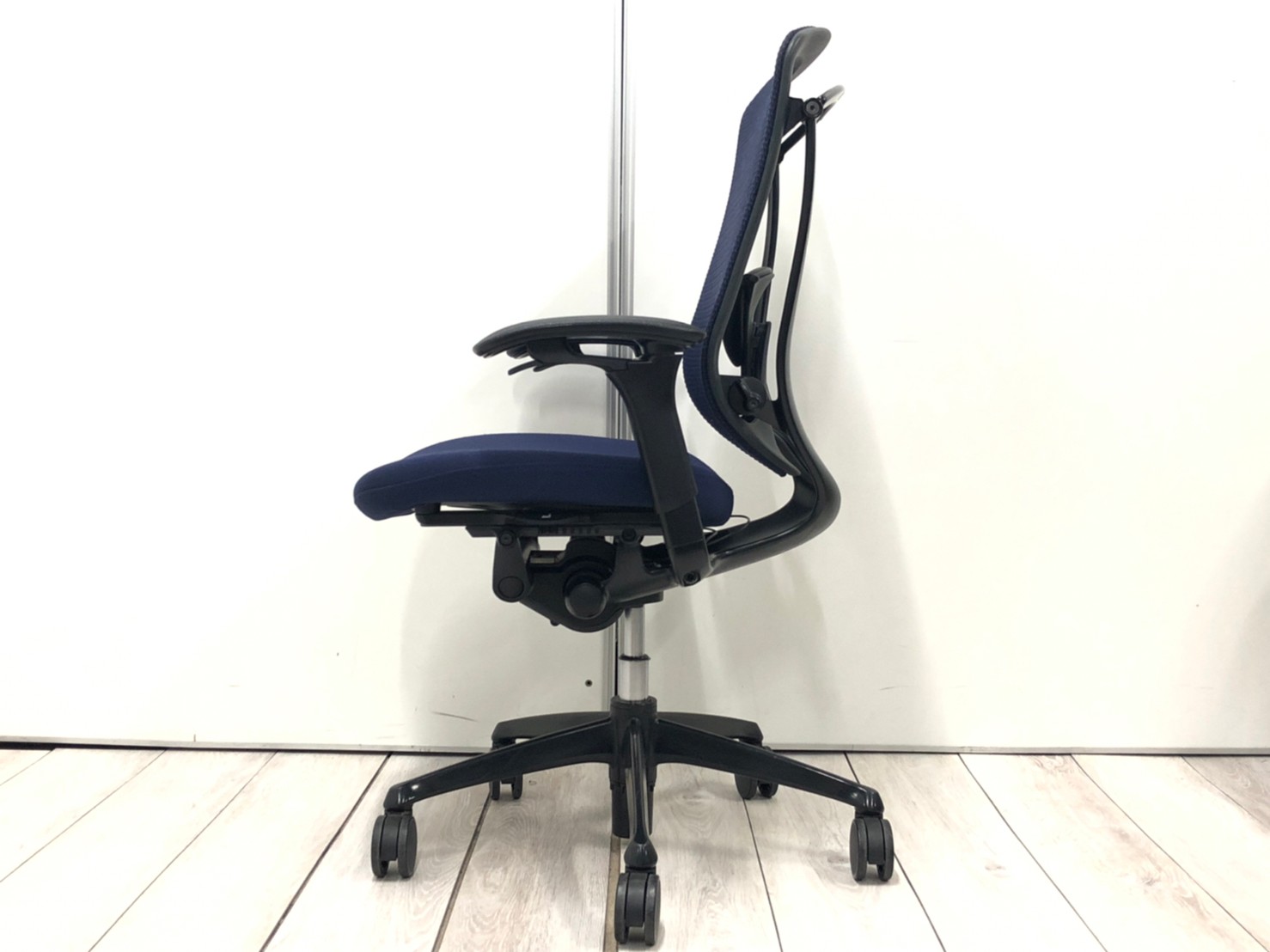 【オカムラ製の最高級チェアが残り1脚限りです!!】オフィスバスターズ 東大阪店 オカムラ製 コンテッサ シリーズ ダークブルー アジャストアーム※可動肘 背/座面メッシュ ランバー 世界で認められた革新的タスクチェア!人間工学に基づいた快適な座り心地を実現! 肘付きハイバックチェア!! 中古 外部倉庫品