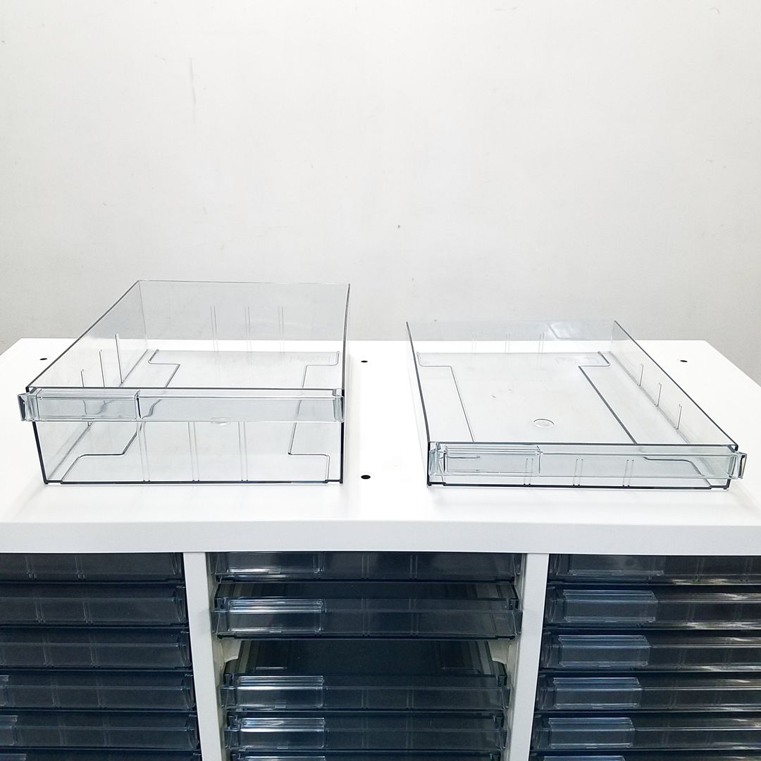 【書類・備品整理の必需品!書類や備品のストックにピッタリ!※1段目のみ浅型仕様】オカムラ レクトライン クリスタルトレー 書類 引き出し 透明 ケース ローキャビネット 整理 中古家具 オフィス家具 福岡 九州最大級《オフィスバスターズ福岡博多店は、福岡を拠点として、日本全国へ中古オフィス用品・オフィス家具を提供しております》