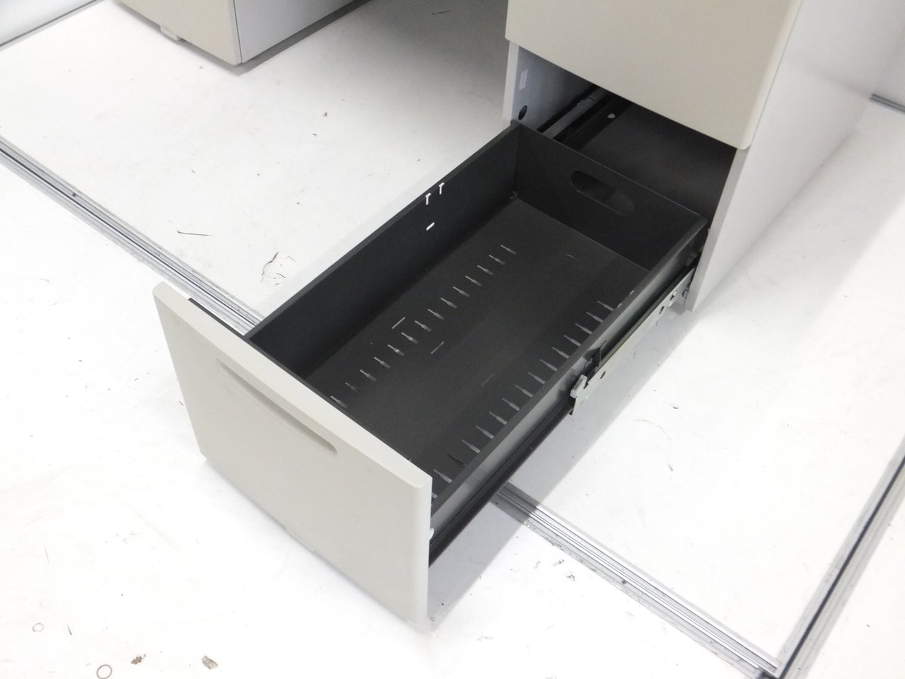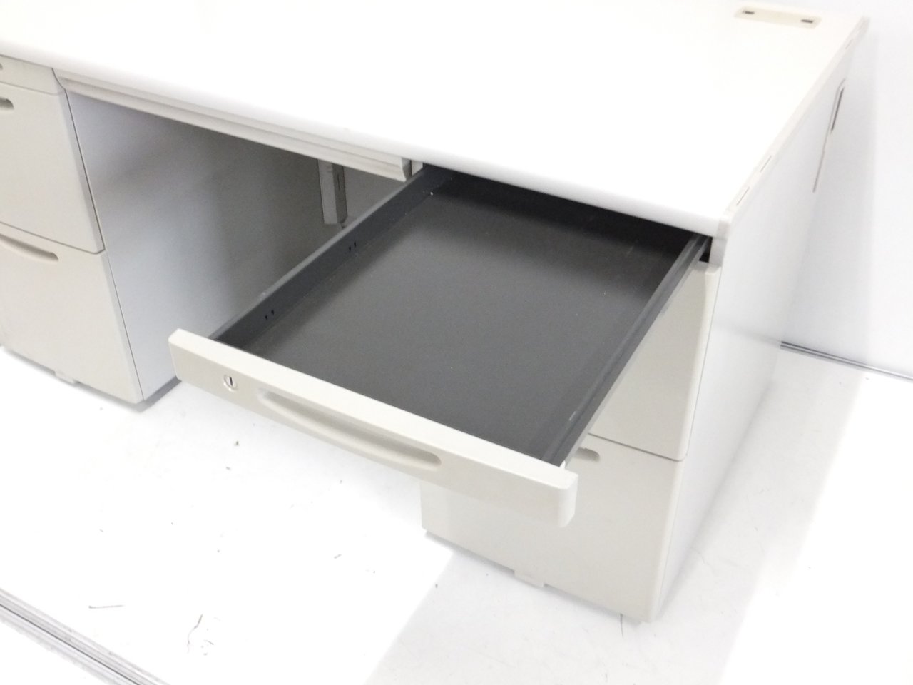 - 袖机のワゴンは、最下段がロング引出しになっており、従来より収納力120%アップ。