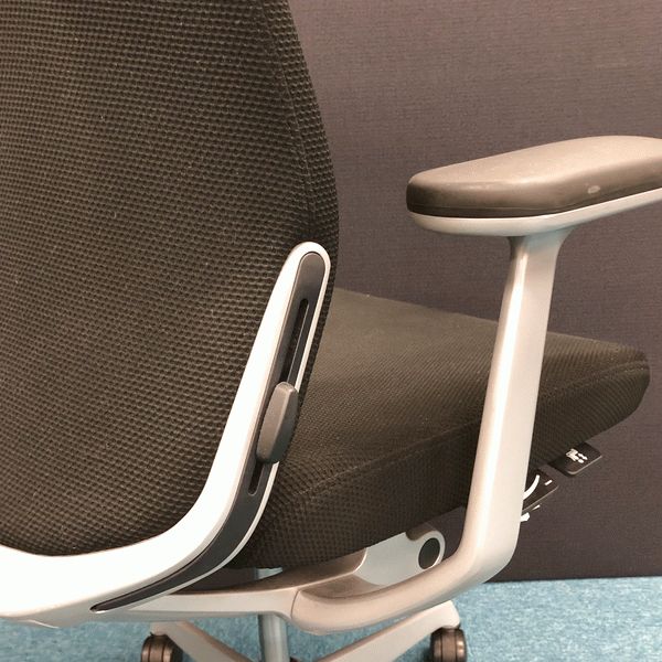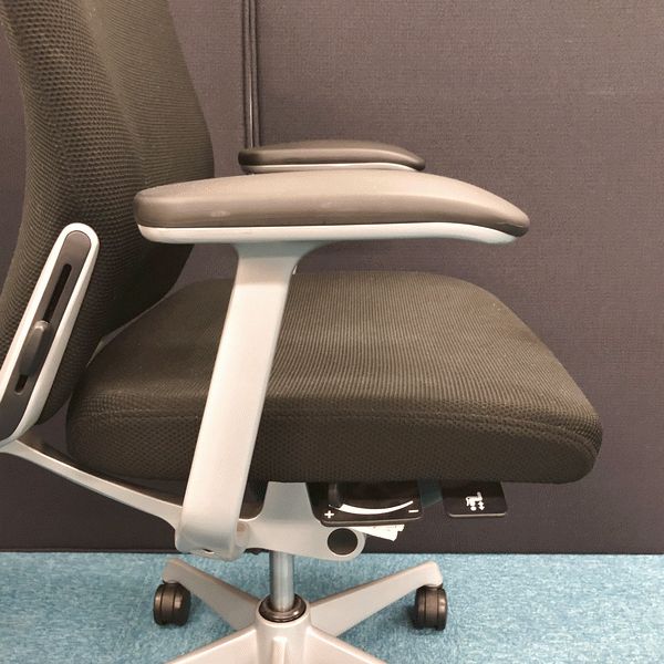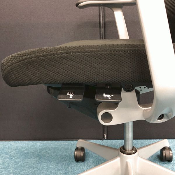 そしてこの調整レバーの中でも飛び抜けて便利なのが、""クイックスライドオペレーション""という背もたれのリクライニング反力調整のレバーです。多くのチェアではリクライニング反力調整のレバーはノブのような形になっており、かがんで座面の下に手を伸ばし、グルグルと回さなくては調節できず面倒なものでした。しかしコーラルではこれも座面裏にあり、座ったままレバーをスライドさせるだけで調節できるのです。この操作性をぜひ体感してみてください! "