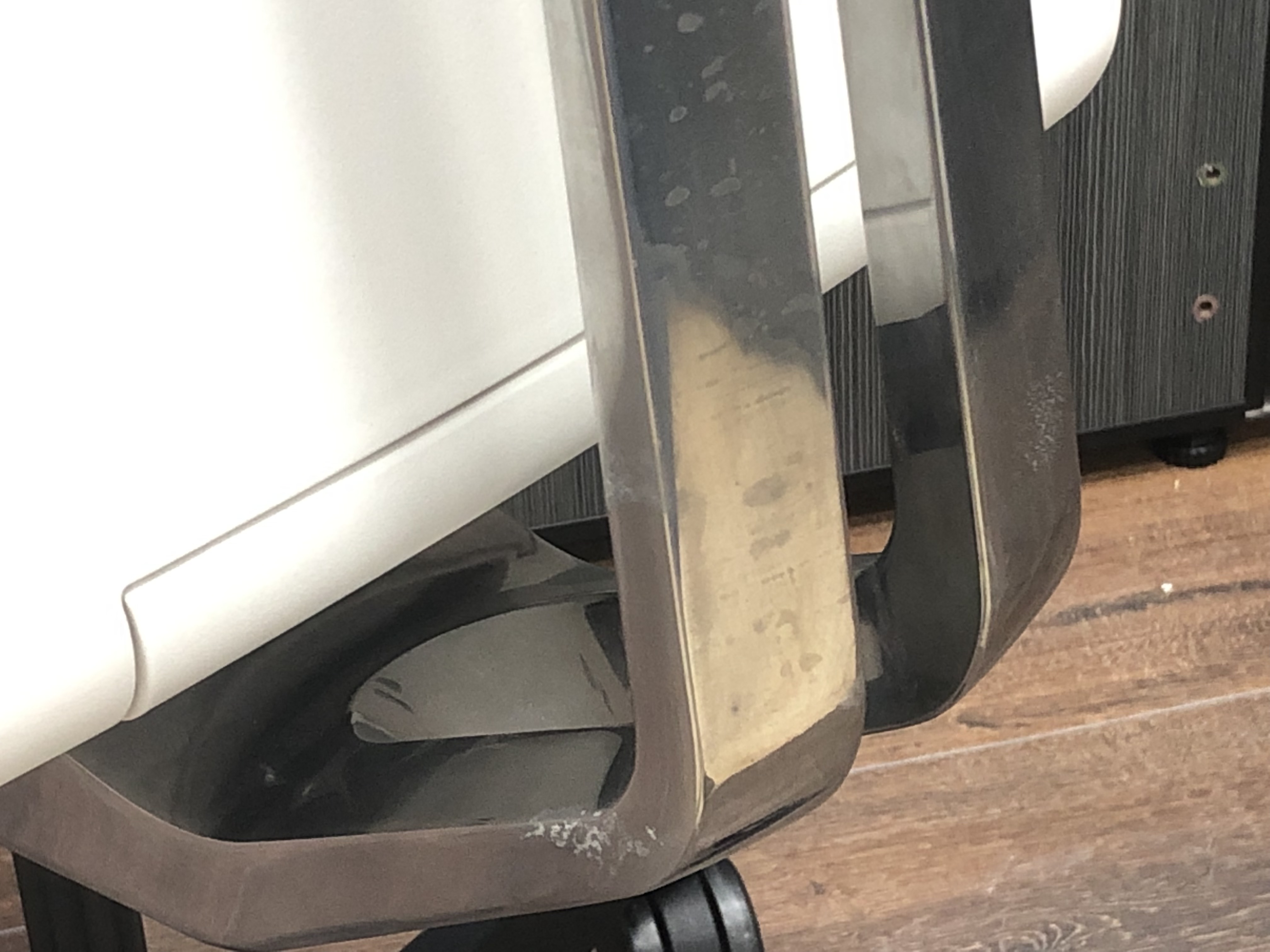 - かなり強い濃い黄ばみ・変色が商品全体にある。(例、座面・背もたれ、脚部等にある。)