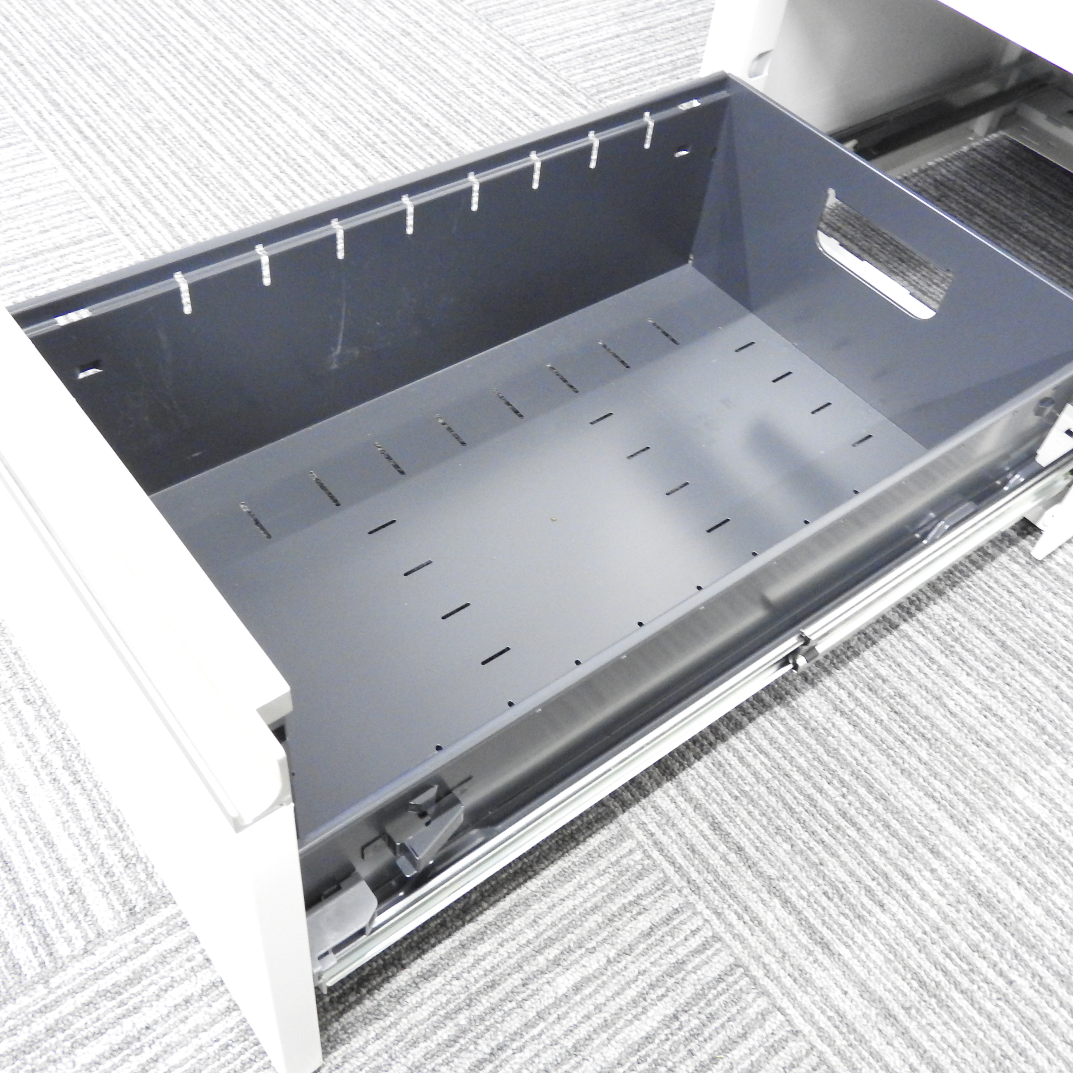 - 一部不具合ありその脇机・ワゴンの本来の効用を果たすための機能以外の一部が使用不可な状態。(例、引出が開閉しづらい、 キャスターロック機能使用不可、ラッチ不良 等がある。)