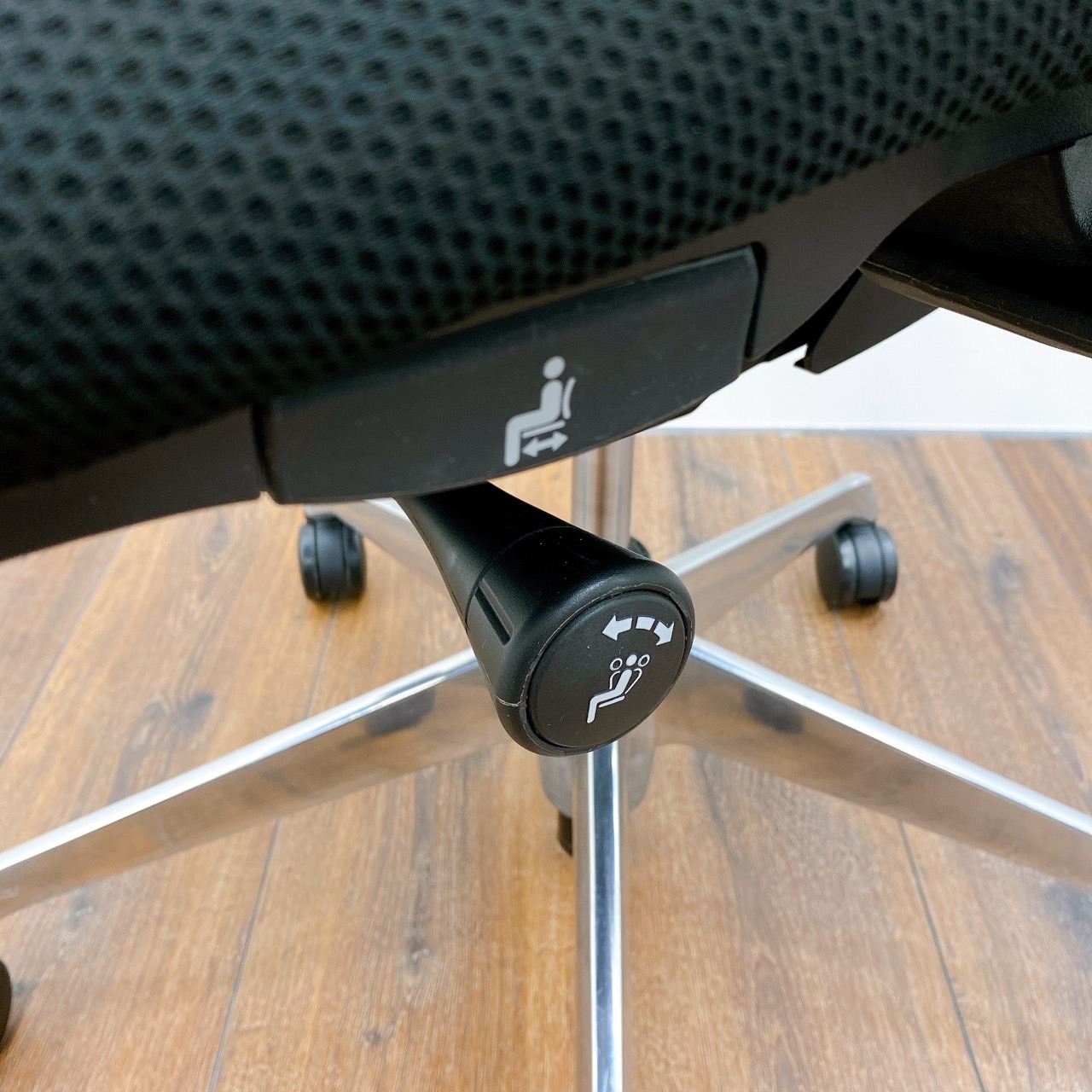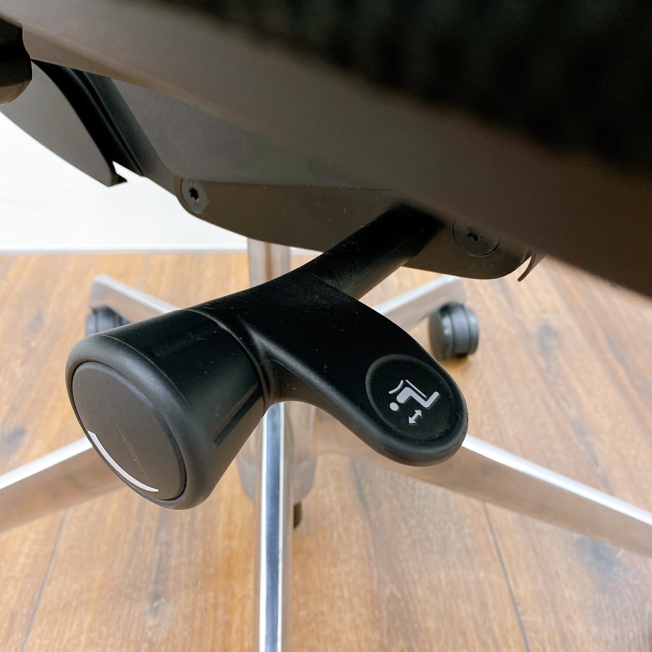 - 座面右下のダイヤル操作で、リクライニングの強弱調整が行えます。これまでのダイヤル式よりも、少ない回転数で、最弱?最強の調整が可能です。