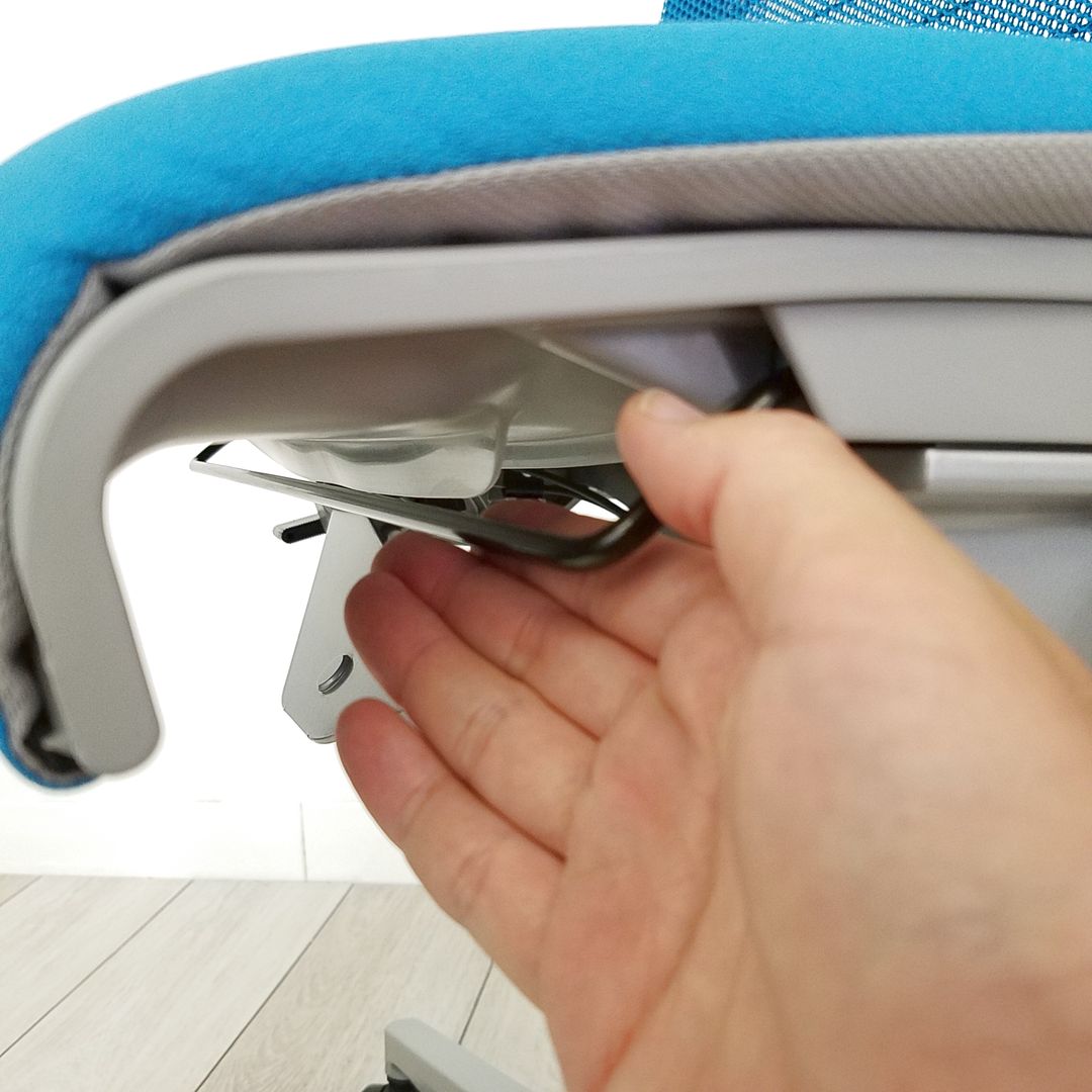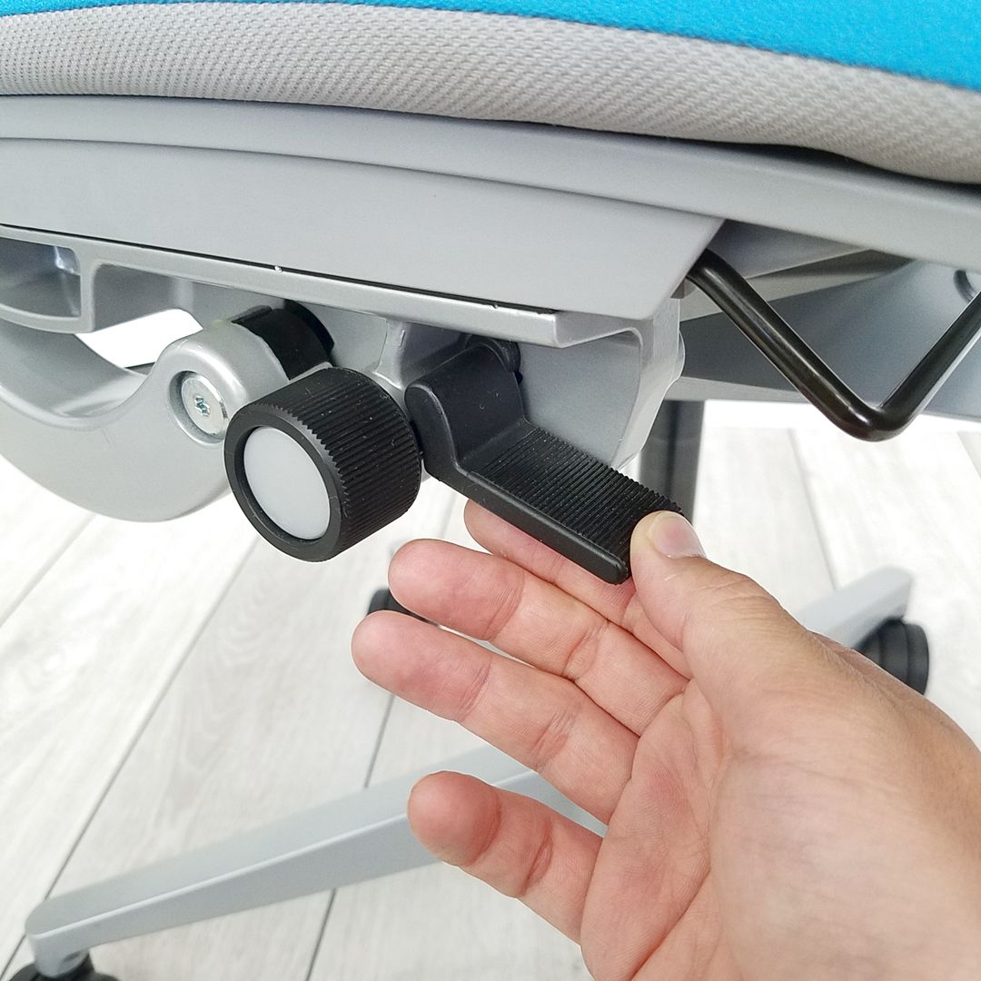 - レバーを引き上げながら座面を前後にスライドさせ、レバーを放すとロックします。背もたれに身体をつけた状態で膝の裏側と座面のエッジの間に5-8センチほどの隙間ができるのが理想的です。