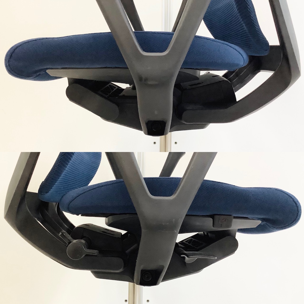 - 座面下のレバー操作により、座面を50mmのストローク(16.7mmピッチ)で好みの位置に調節できます。体格や作業姿勢に合わせたポジション設定が行えます。