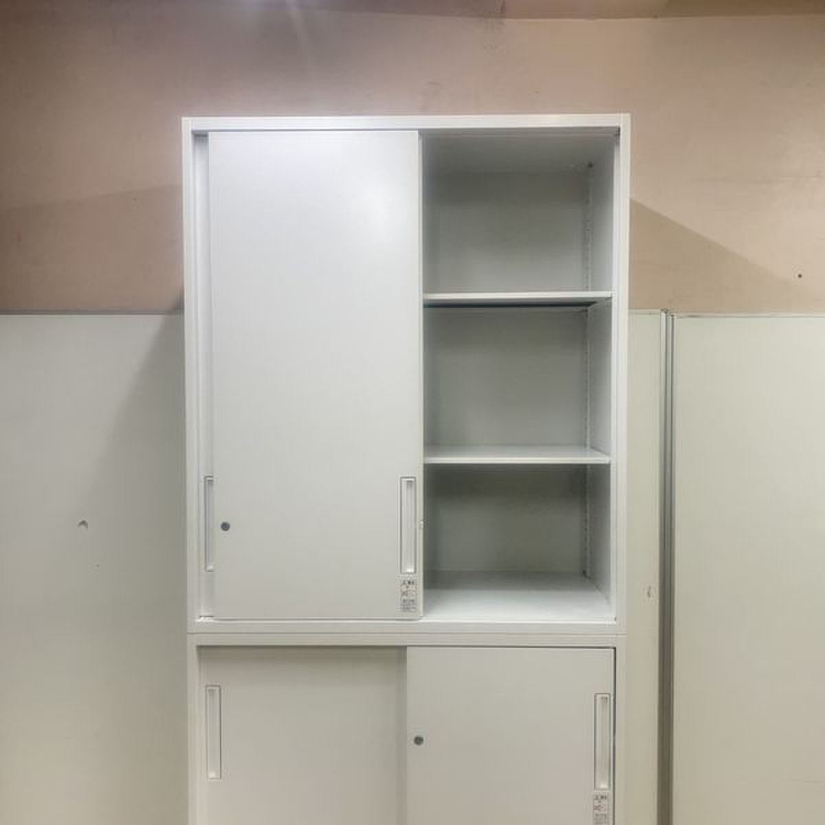 上下段ともに引き違い戸タイプの書庫のため、