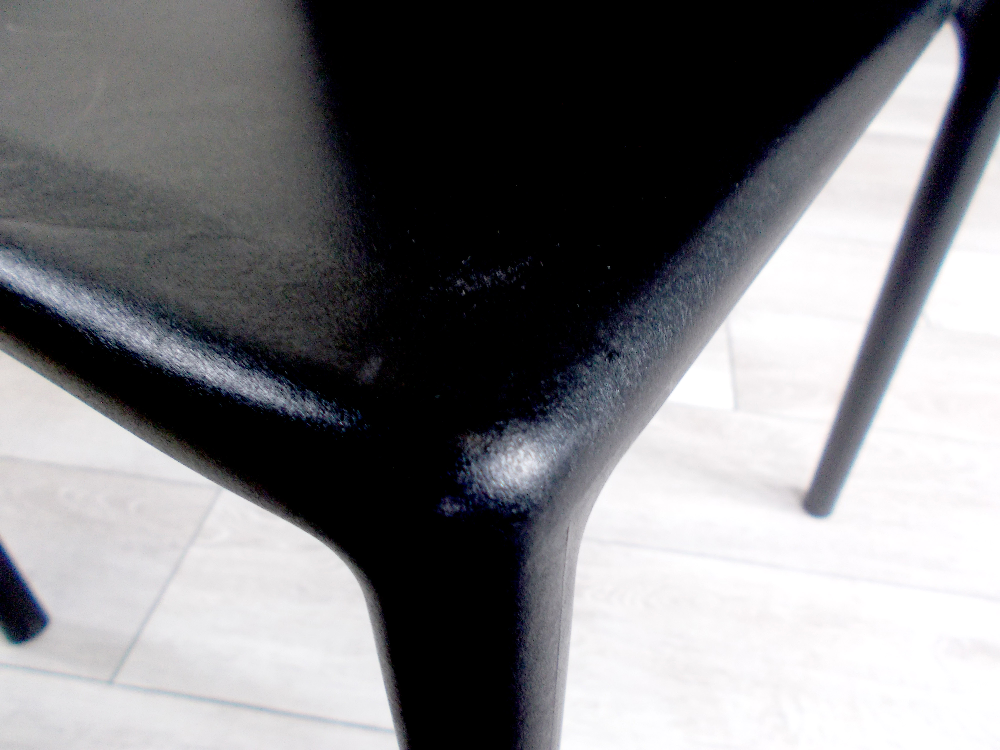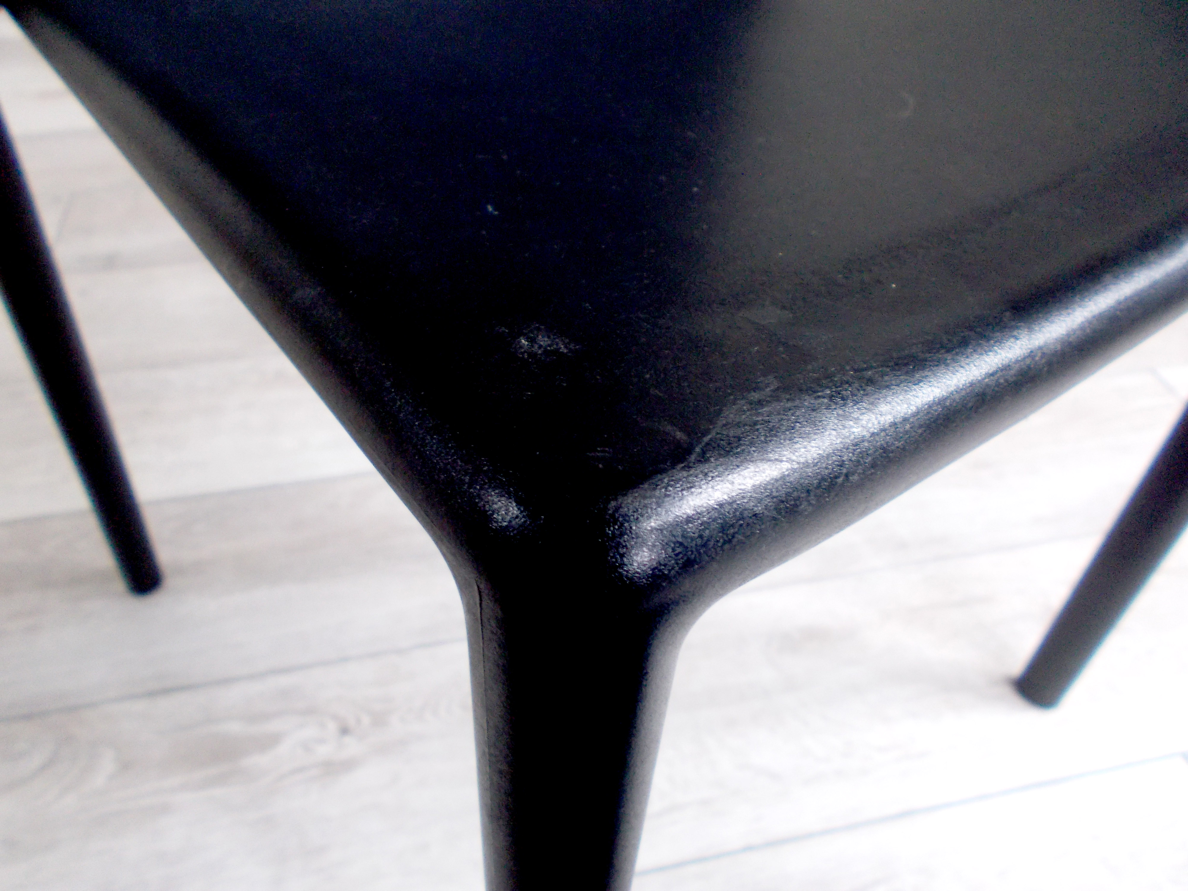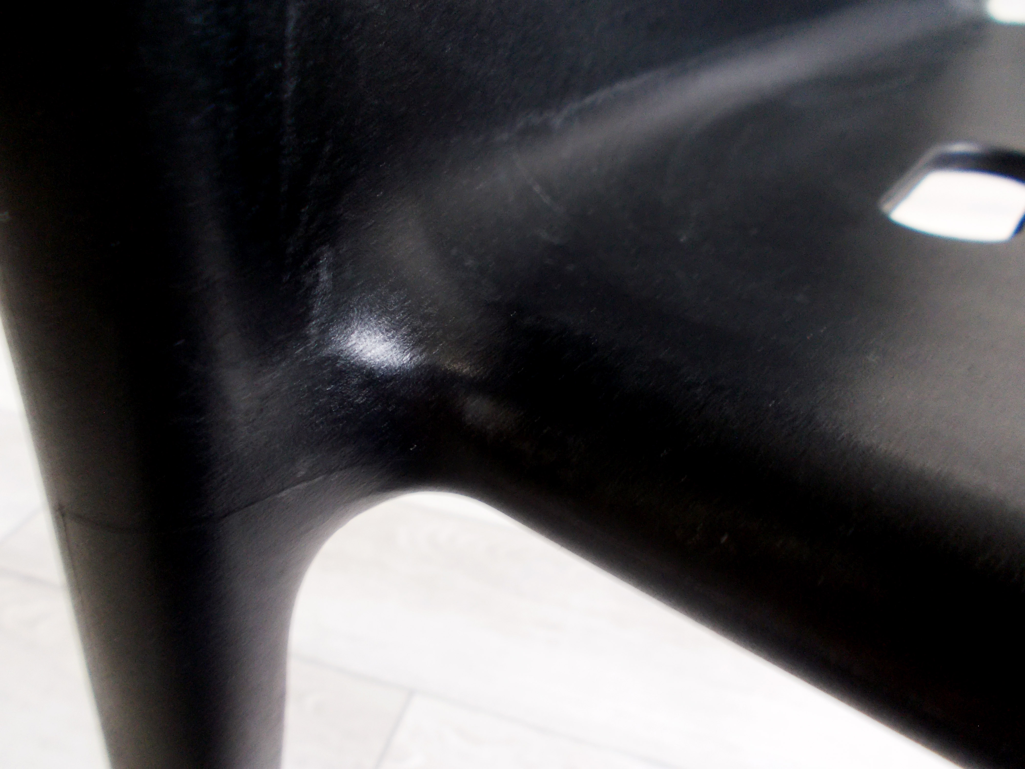 - かなり強い濃い黄ばみ・変色が商品全体にある。(例、座面・背もたれ、脚部等にある。)