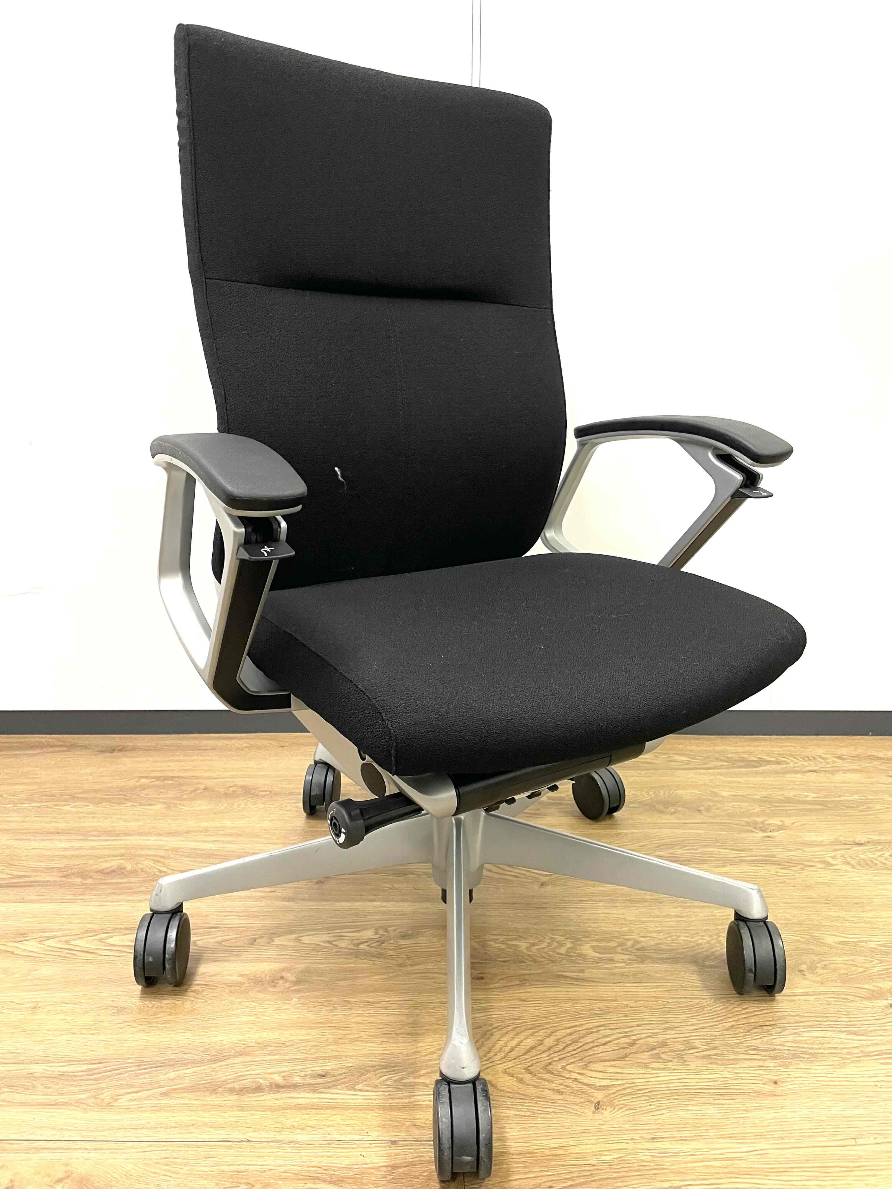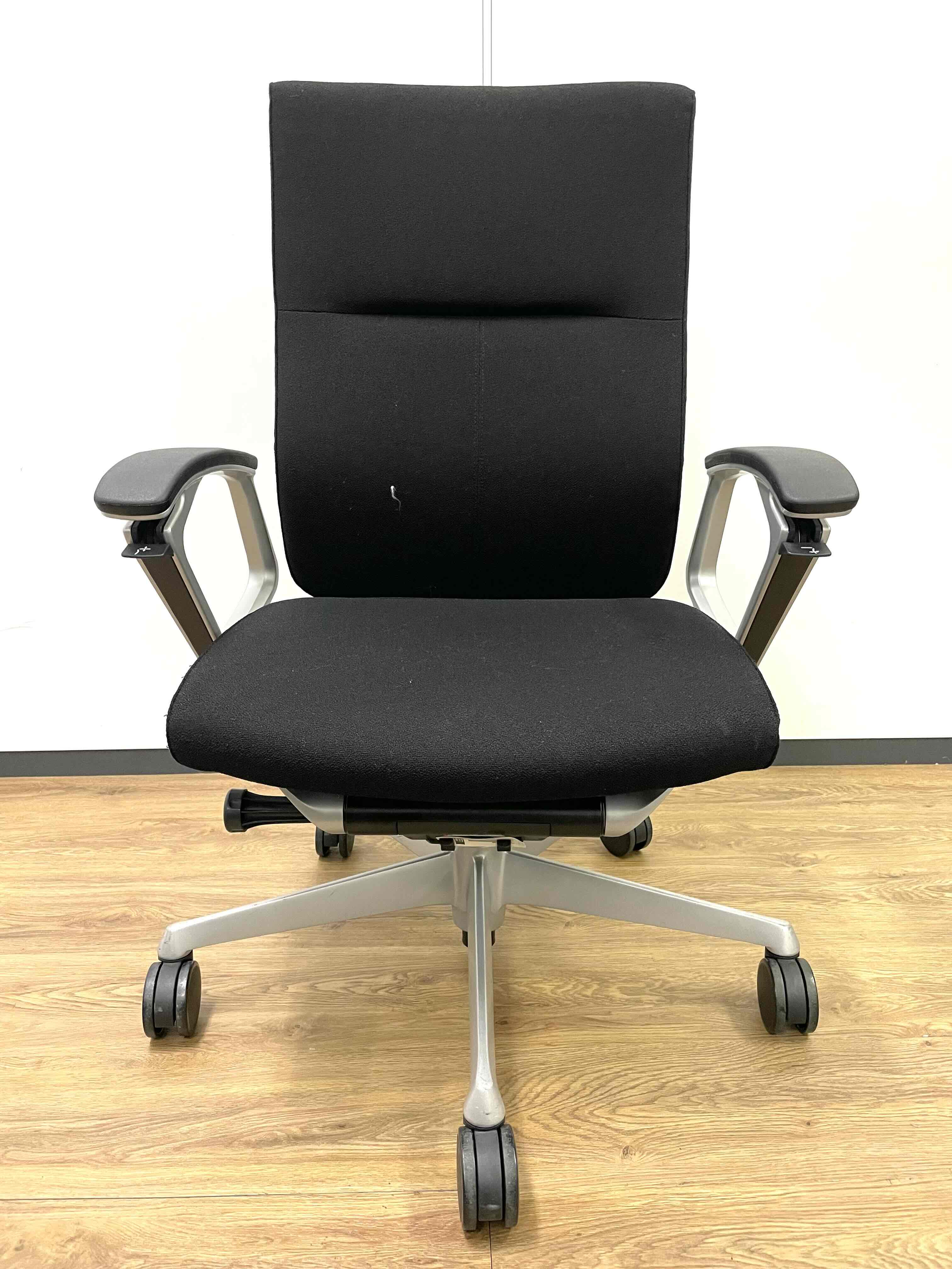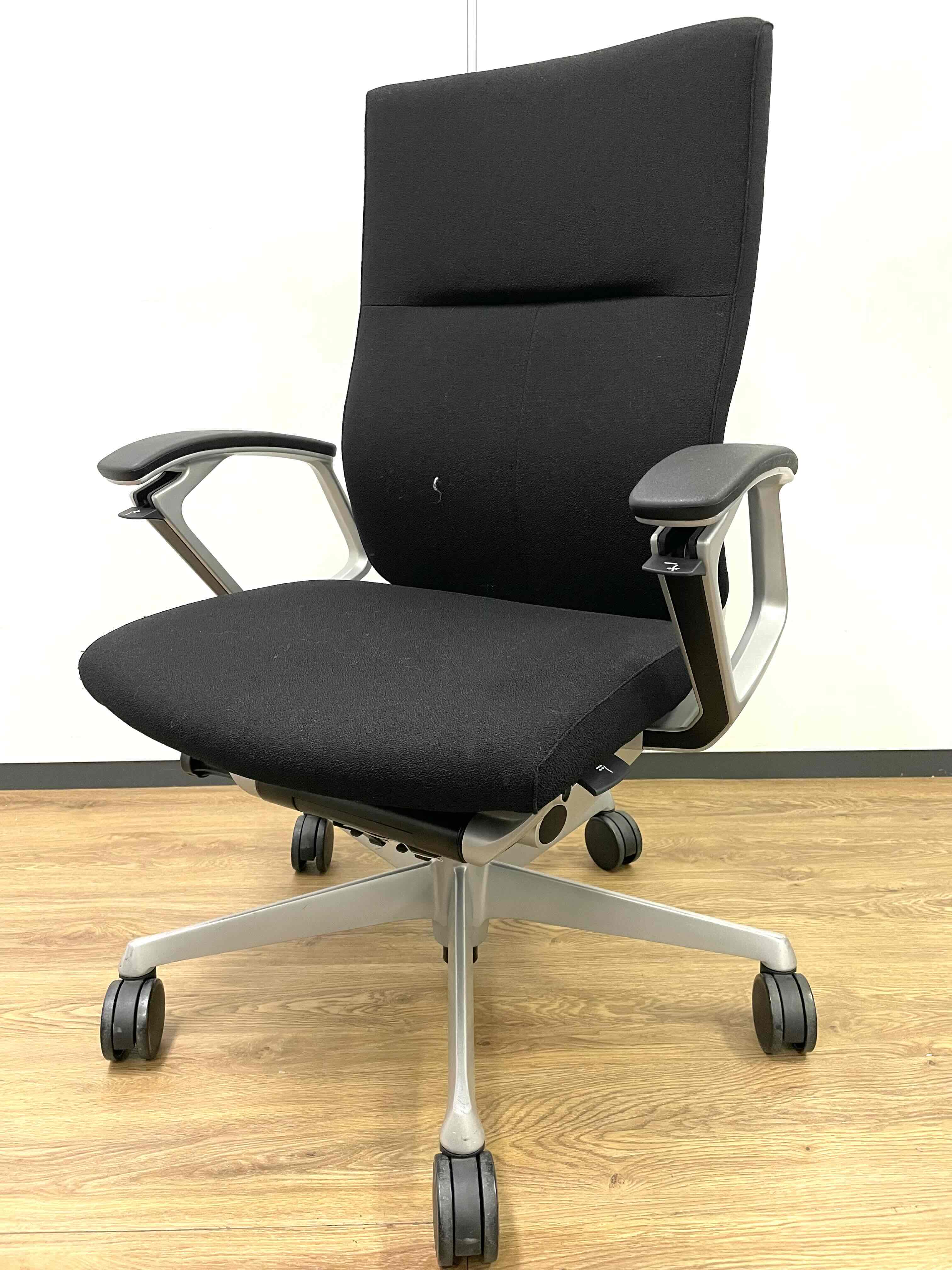 ※ひじ掛け部分に使用感ありのため、特価!【オカムラの最上級モデル!高級感と機能性を融合させたチェア!】■ハイバック 肘付き 背・座クロス張地(スエード調) 固定肘 ※サイド剥がれ有り ランバーサポート付き ブラック/オカムラ/デューク