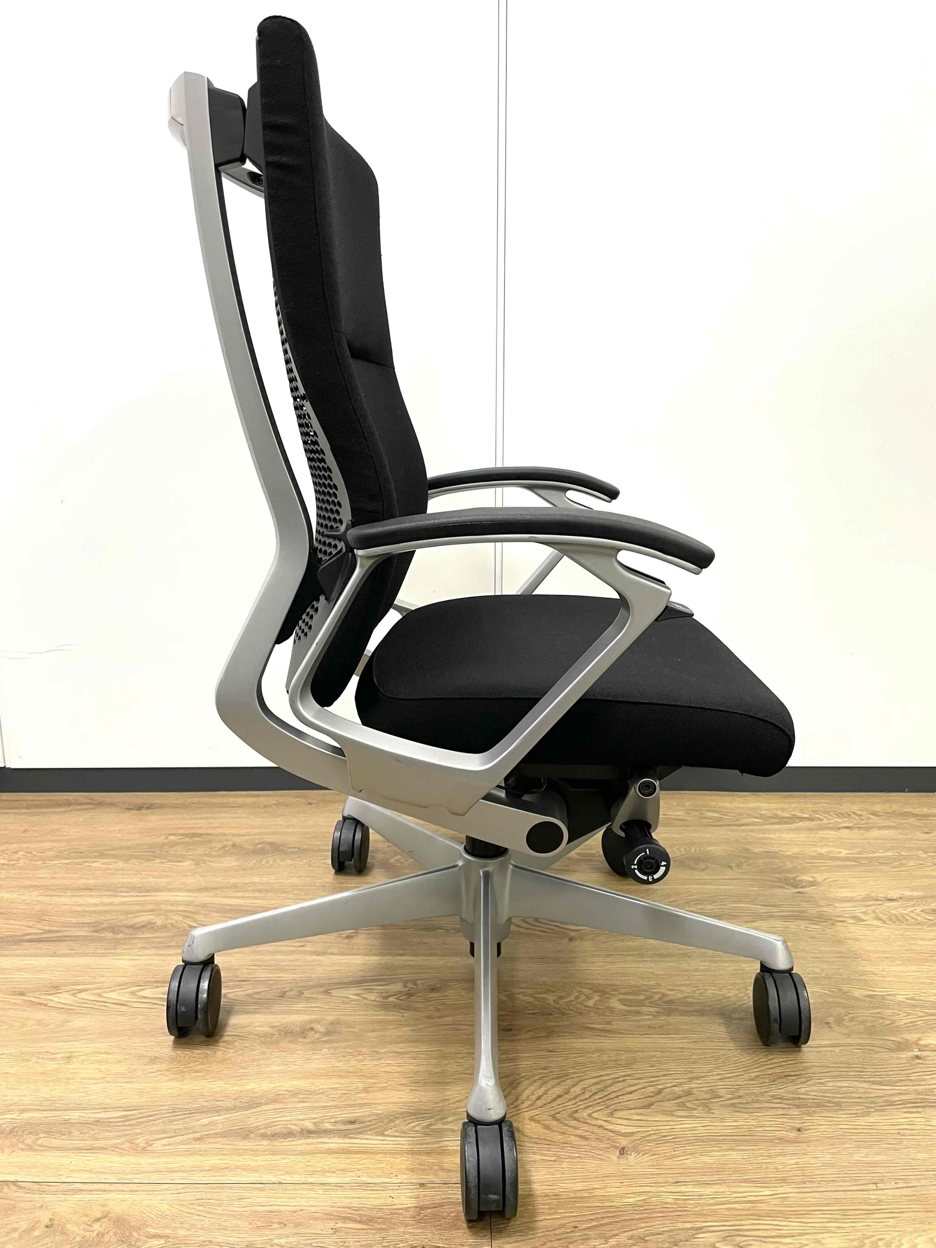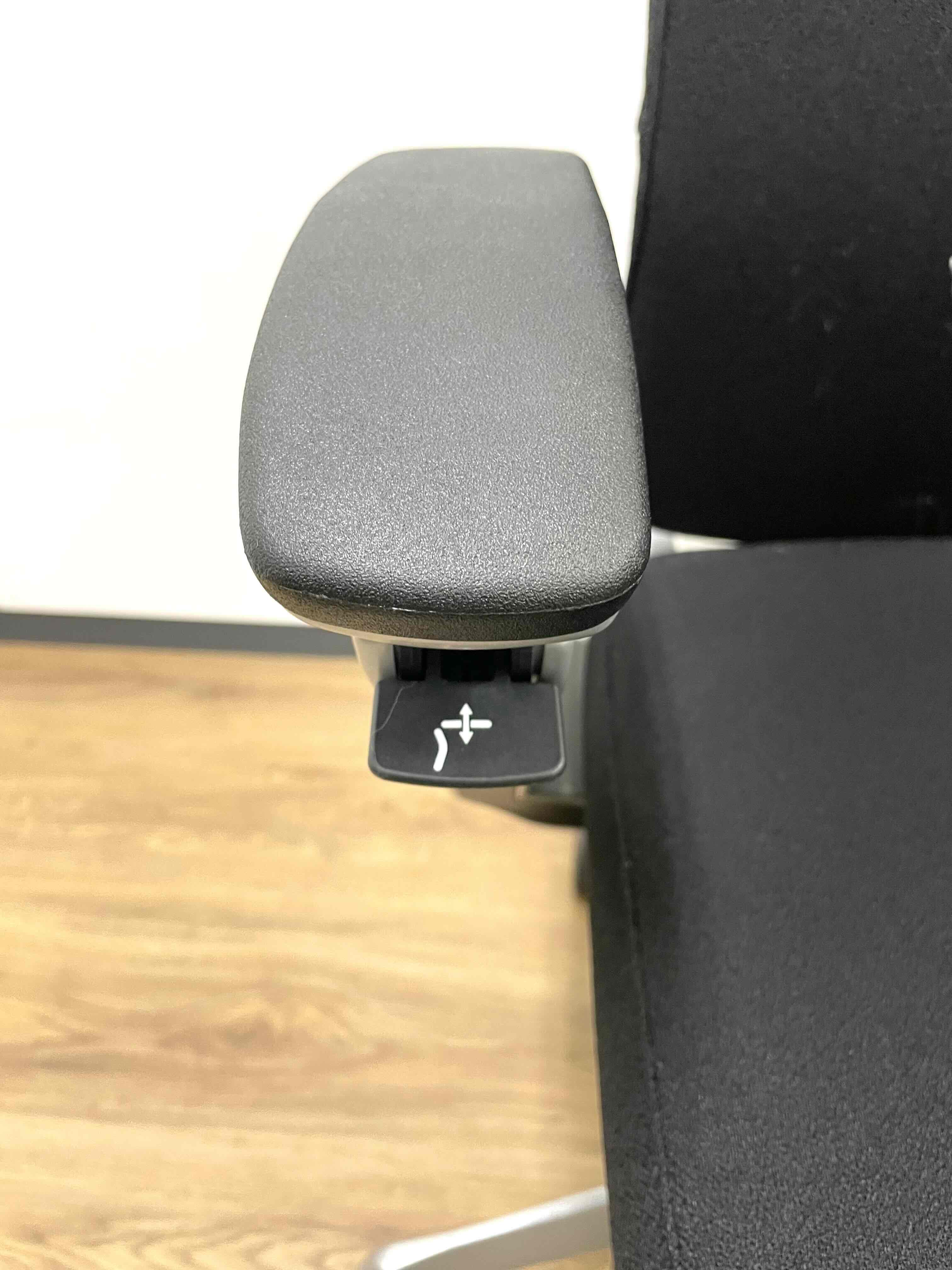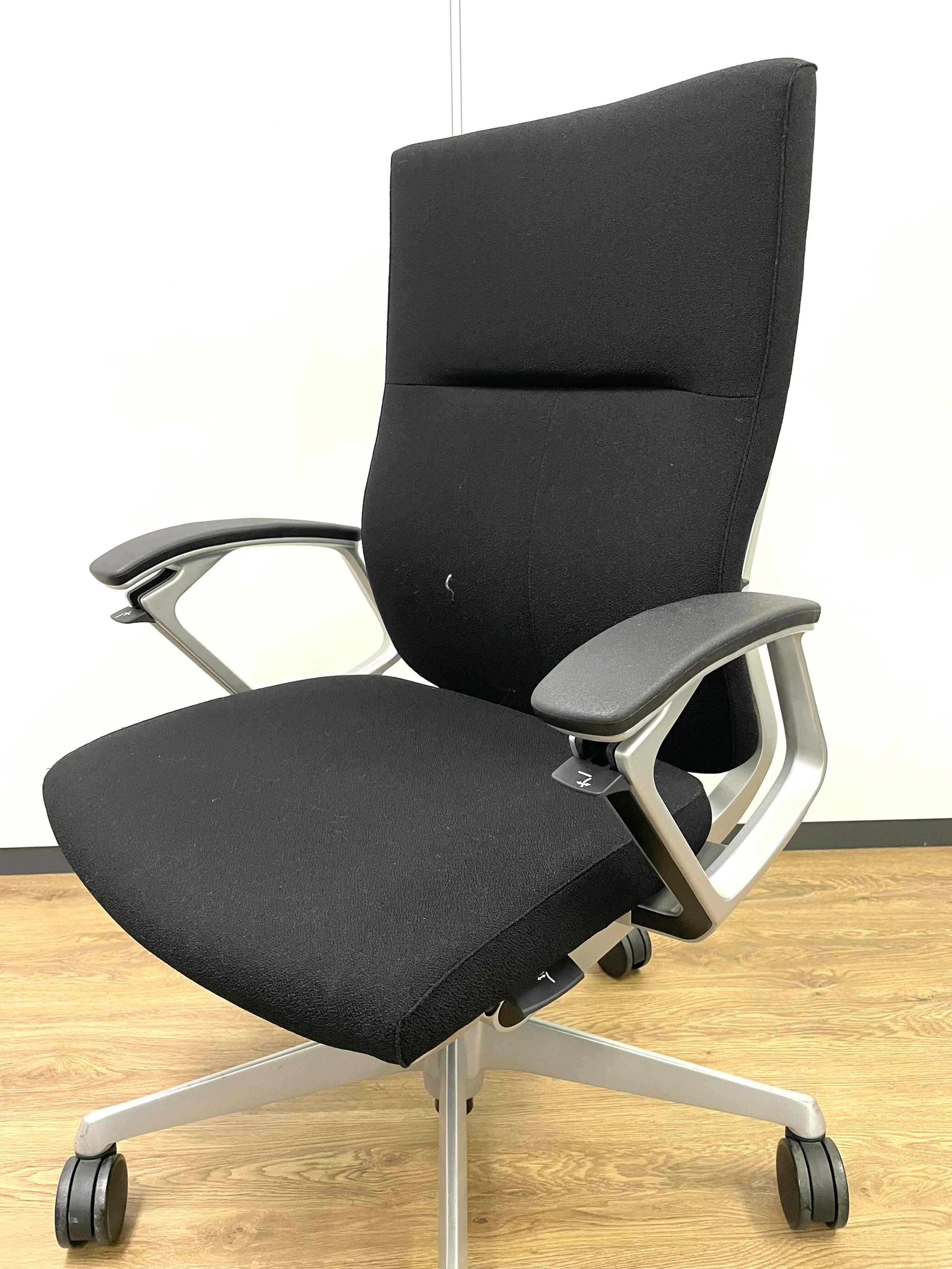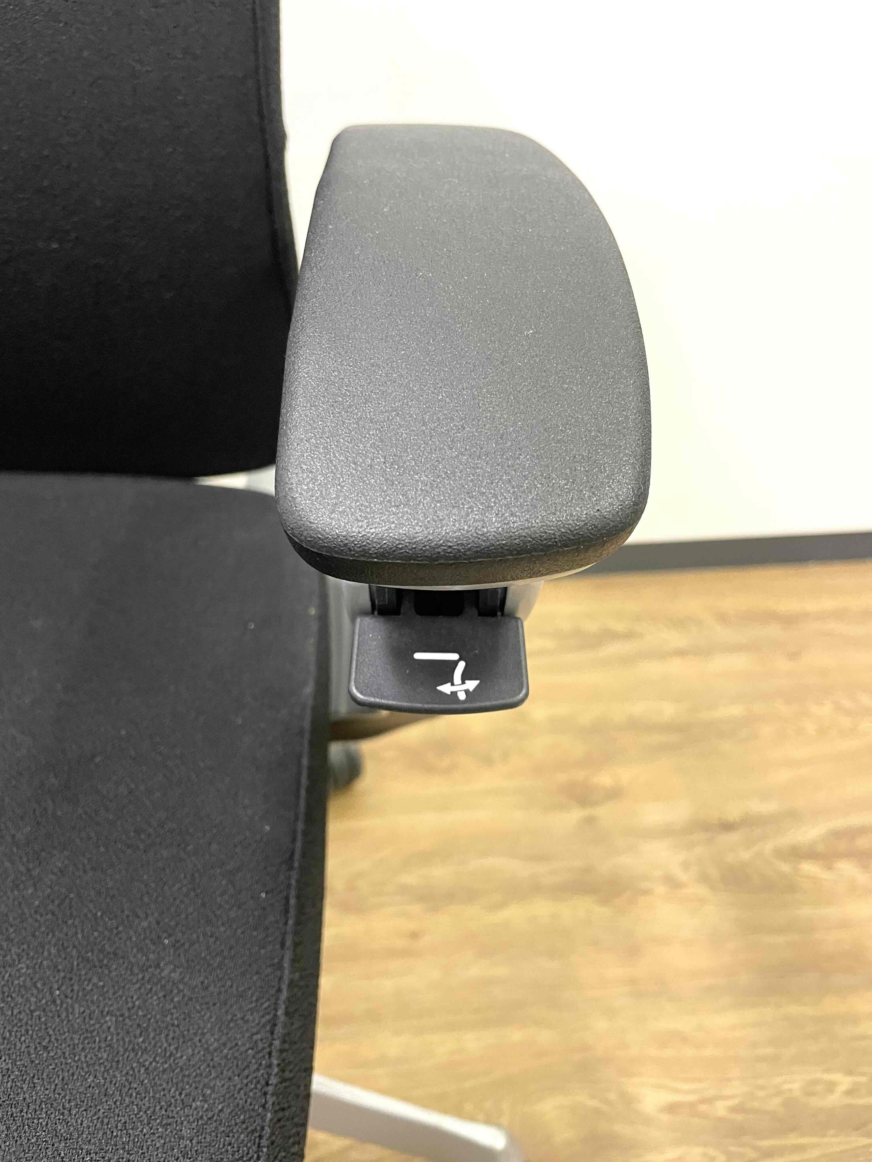 ※ひじ掛け部分に使用感ありのため、特価!【オカムラの最上級モデル!高級感と機能性を融合させたチェア!】■ハイバック 肘付き 背・座クロス張地(スエード調) 固定肘 ※サイド剥がれ有り ランバーサポート付き ブラック/オカムラ/デューク