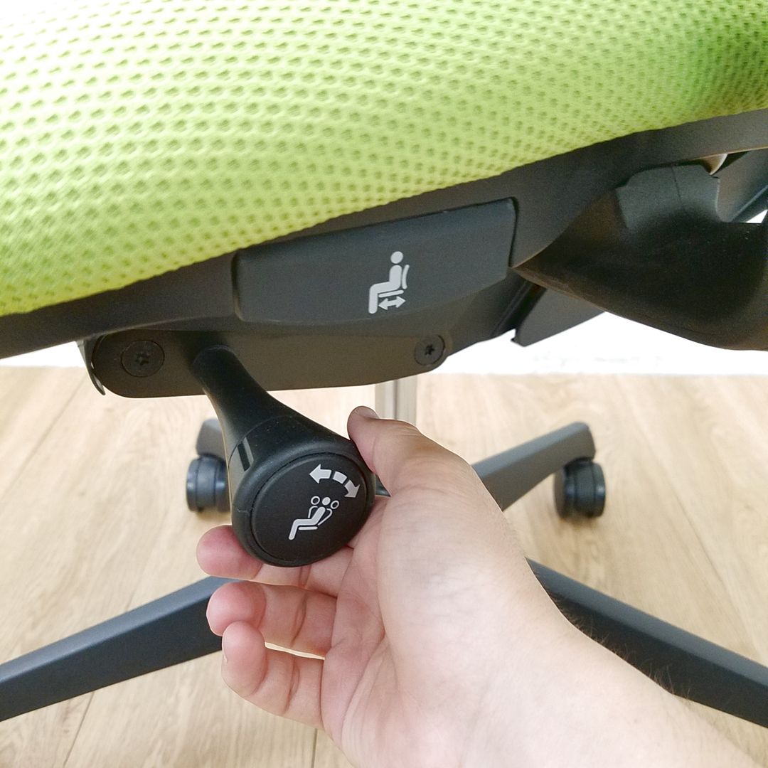 - 座面左下のダイヤルでリクライニングの固定と解除が行えます。 前傾ポジションをとることも可能です。