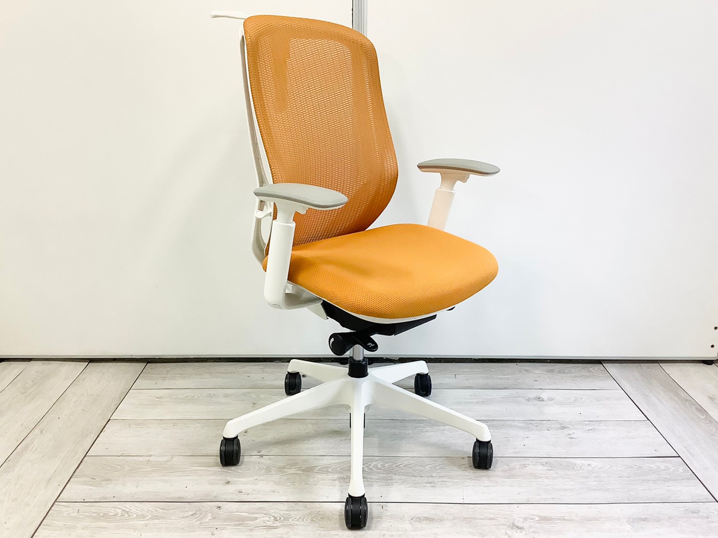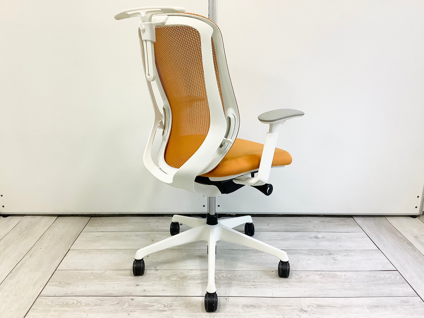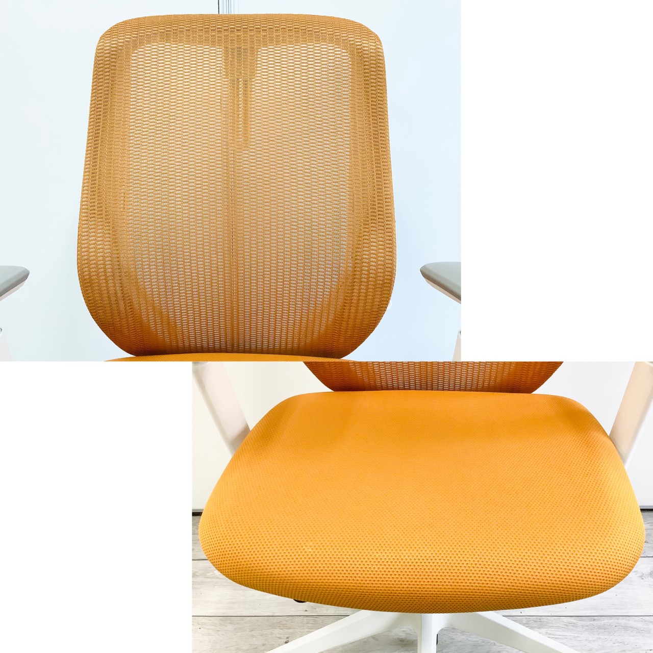 【状態要考慮座面ホツレあり】【通常使用問題ありません!】オレンジカラーオフィス&ご自宅おススメシルフィ―(Sylphy)チェア※ポリッシュフレーム&可動肘掛け&新品ヘッドレスト付◆オカムラ製【2509】弊社使用欄【A01036295 A01031968】