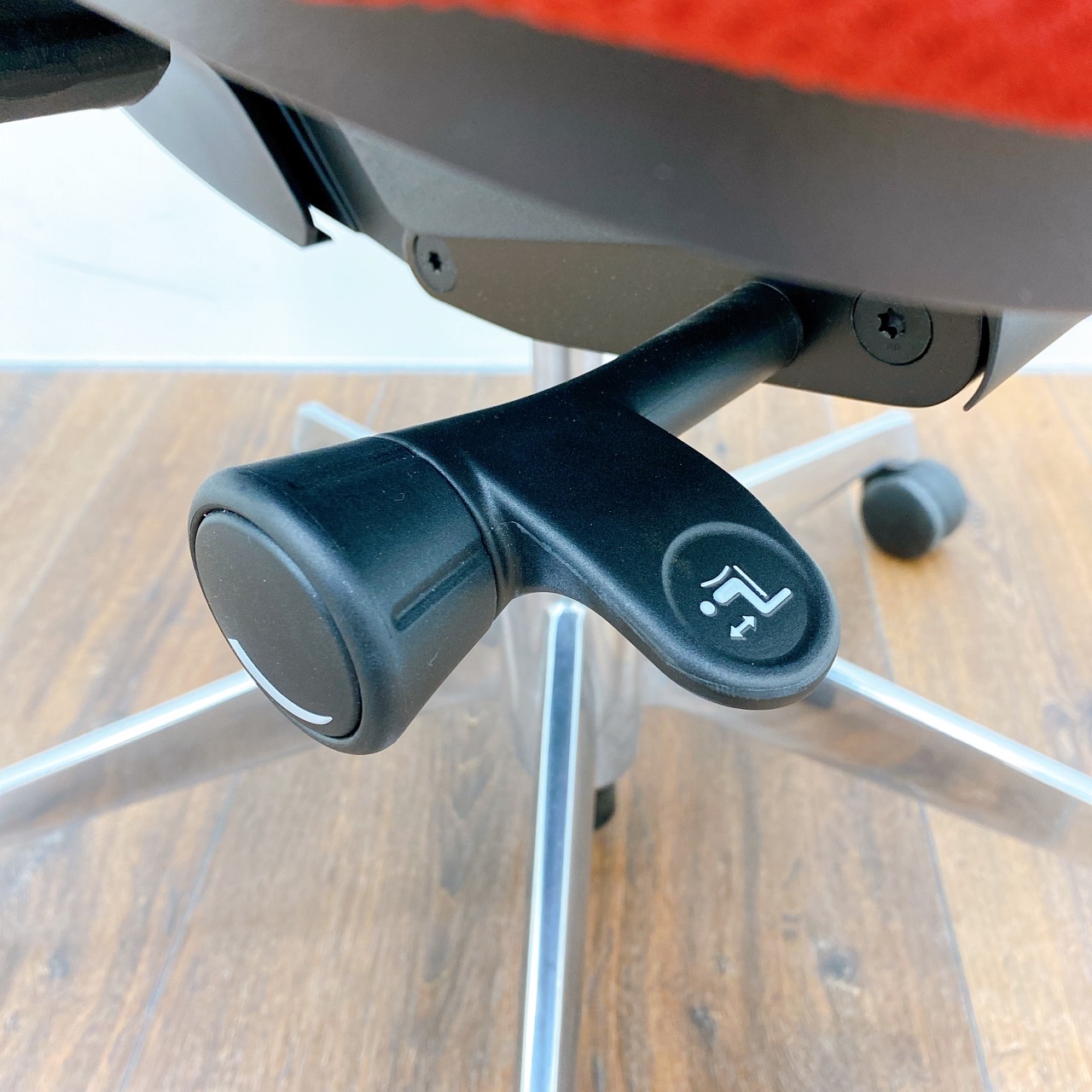 - 座面右下のダイヤル操作で、リクライニングの強弱調整が行えます。これまでのダイヤル式よりも、少ない回転数で、最弱?最強の調整が可能です。